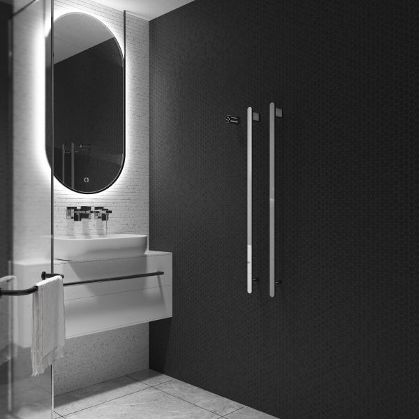 Полотенцесушитель электрический 336*1000 мм (хром). Полотенцесушитель электрический (встраиваемый) c терморегулятором. Тип монтажа: встраиваемый в стену. Подключение: скрытое. Электронная панель управления. Диапазон регулировки температуры 45-60 градусов. Таймер включения и отключения. Напряжение 220 вольт. Влагозащищенность IPX4. Мощность: 72 Ватт. Особенностью данной модели является встраиваемая конструкция. После монтажа, панель управления, а также нагревательные элементы, визуально не имеют соединения, что поможет дизайнерам при создании стильных интерьеров. С помощью электронной панели управления можно задать оптимальный режим нагрева полотенцесушителя в пределах от 45 до 60 градусов. Встроенный таймер позволяет установить время включения и отключения устройства с шагом в 1 час, что делает его использование еще более комфортным и экономичным.