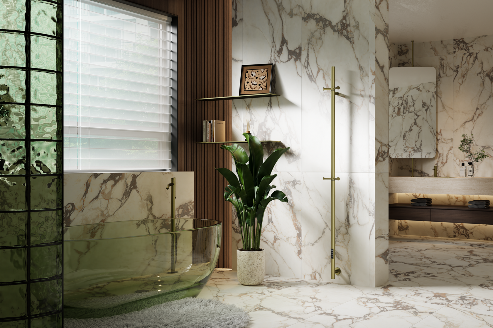 Полотенцесушитель электрический 200*1700 мм (золото шлифованное). Полотенцесушитель электрический с терморегулятором и поворотными крючками. Тип монтажа: на стену. Подключение: скрытое. Электронная панель управления. Диапазон регулировки температуры 45-60 градусов. Таймер включения и отключения. Напряжение 220 вольт. Влагозащищенность IPX4. Мощность: 50 Ватт. С помощью электронной панели управления можно задать оптимальный режим нагрева полотенцесушителя в пределах от 45 до 60 градусов. С влагозащитой IPX4, полотенцесушитель безопасно переносит брызги и дождь. Встроенный таймер позволяет установить время включения и отключения устройства с шагом в 1 час, что делает его использование еще более комфортным и экономичным. Особенностью полотенцесушителя являются поворотные крючки. Крючки свободно вращаются вокруг оси полотенцесушителя и могут быть использованы как для вешания полотенец, так и банных халатов.