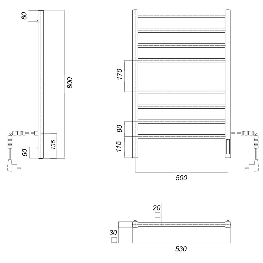 М/о расстояние (межосевое расстояние): 500Количество перекладин: 8Коллекция: КвадроТип: электрическиеЦвет: черныйМощность, Вт: 110Ширина (мм): 532Высота (мм): 800Глубина (мм): 80-90Вес: 5,9Объем: 0,04Тэн/подключение: справаСтрана: РоссияГарантия: 2 года