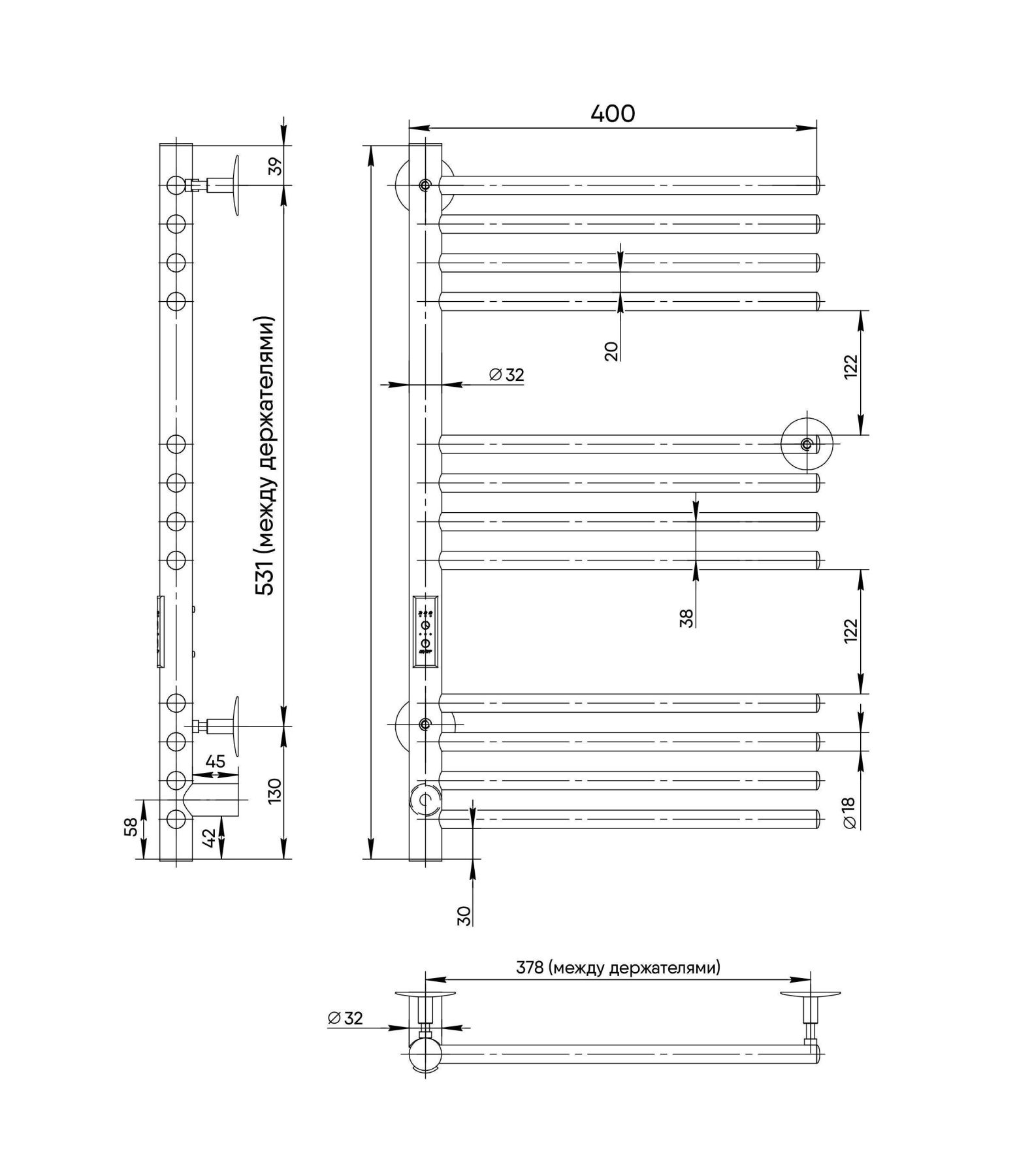 Полотенцесушитель электрический INDIGO Family хром. Полотенцесушитель с одной стойкой, имеет 3 держателя для надежной фиксации на стене. Хромированное изделие с блестящей поверхностью, которое достигается путем электрохимической полировки. Перекладины удобны для размещения большого количества текстильных вещей на просушивание, подходит для большой семьи. С помощью терморегулятора можно регулировать температуру в диапазоне от 40 до 50 градусов (с шагом 5 градусов) — уровень температуры показывается количеством горящих светодиодов. Таймер можно настроить на отключение через 2, 4, 6 часов. Возможно скрытое подключение, а также прямое подключение в розетку, шнур расположен слева изделия, длина 1,1 м. В комплектацию входят: 3 телескопических держателя, комплект монтажа (дюбели и саморезы), инструкция с гарантийным талоном на 3 года. Срок службы изделия не ограничен.