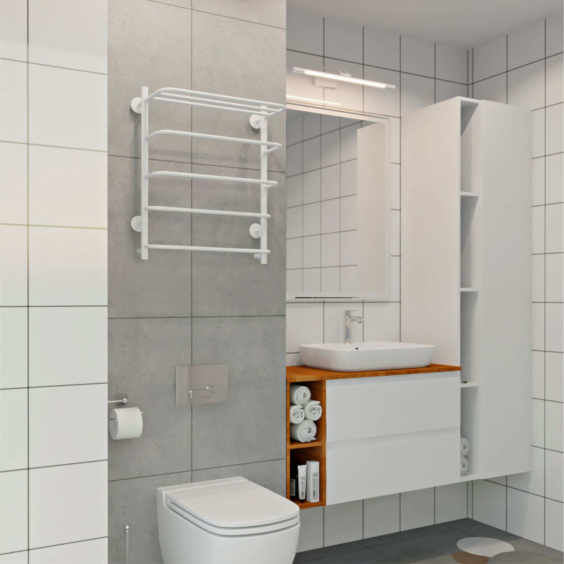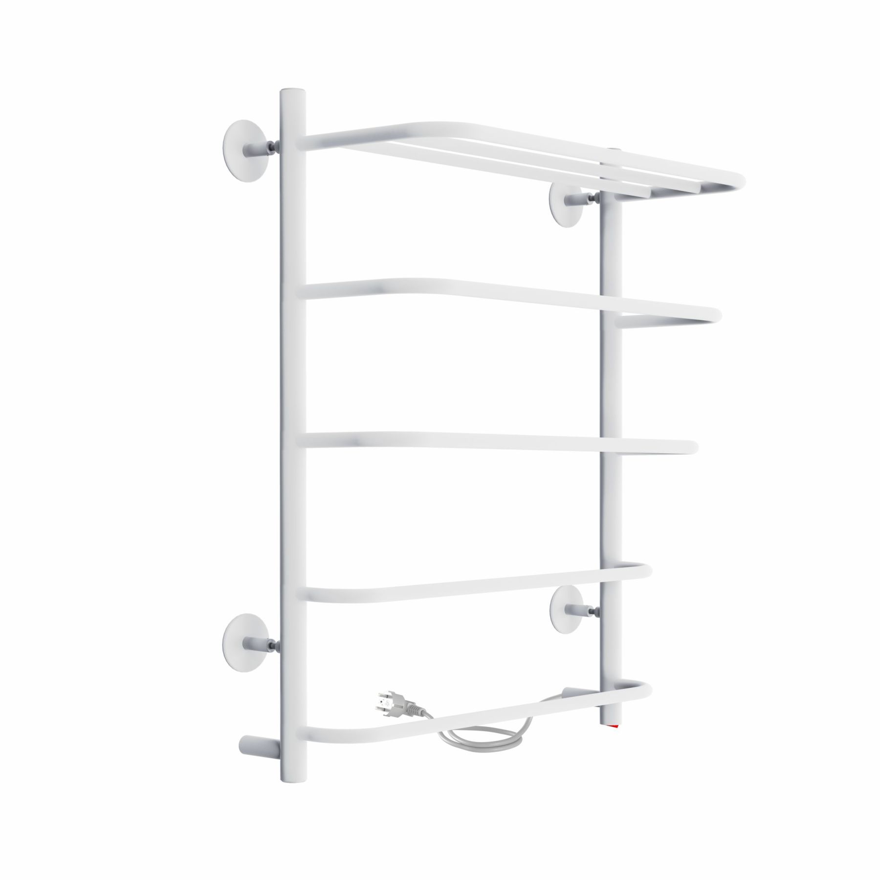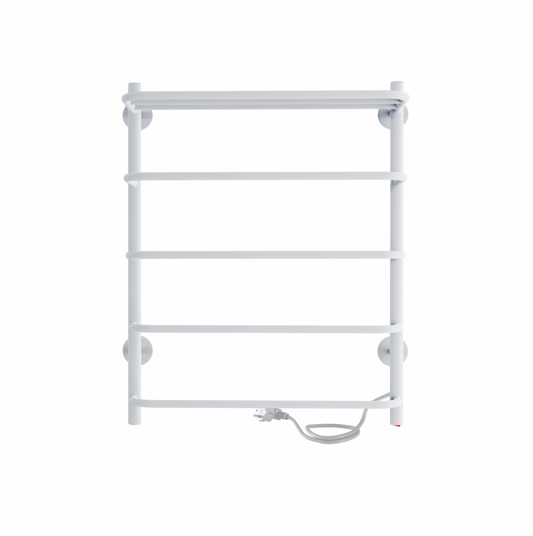 Полотенцесушитель электрический INDIGO в белом матовом оттенке. Пять перекладин и полка позволят разместить достаточное количество текстильных изделий на просушку.