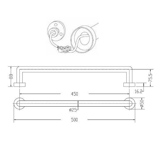 Материал - латунь, круглая латунная труба: Ø25 мм, выступ: 88 мм, электрическое подсоединение скрытое, без выключателя, расстояние между центрами: 450 мм, монтаж: горизонтальный.