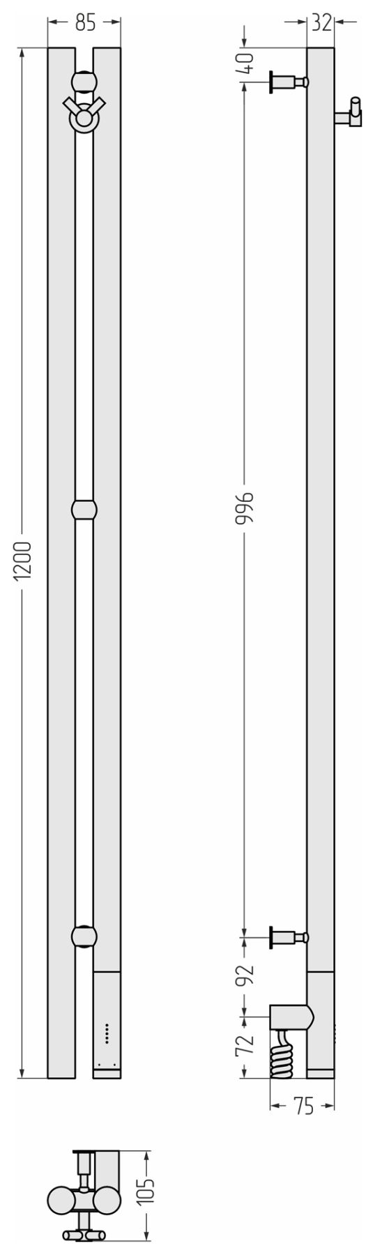 Полотенцесушитель имеет степень защиты IP54, что гарантирует безопасность использования в условиях повышенной влажности. Устройство поставляется со скрытым подключением и кабелем длиной 1,5 м, расположение блока управления и провода находится справа. Габариты прибора составляют 1200 мм в высоту и 85 мм в ширину, благодаря чему он хорошо впишется в пространство любой ванной комнаты.
