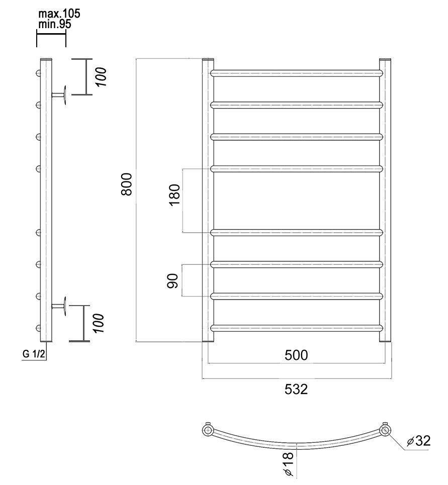 М/о расстояние (межосевое расстояние): 500Количество перекладин: 8Коллекция: КалипсоТип: водяныеЦвет: хромШирина (мм): 532Высота (мм): 800Глубина (мм): 105-95Вес: 5,3Объем: 0,070125Тэн/подключение: нижнееСтрана: РоссияГарантия: 10 лет
