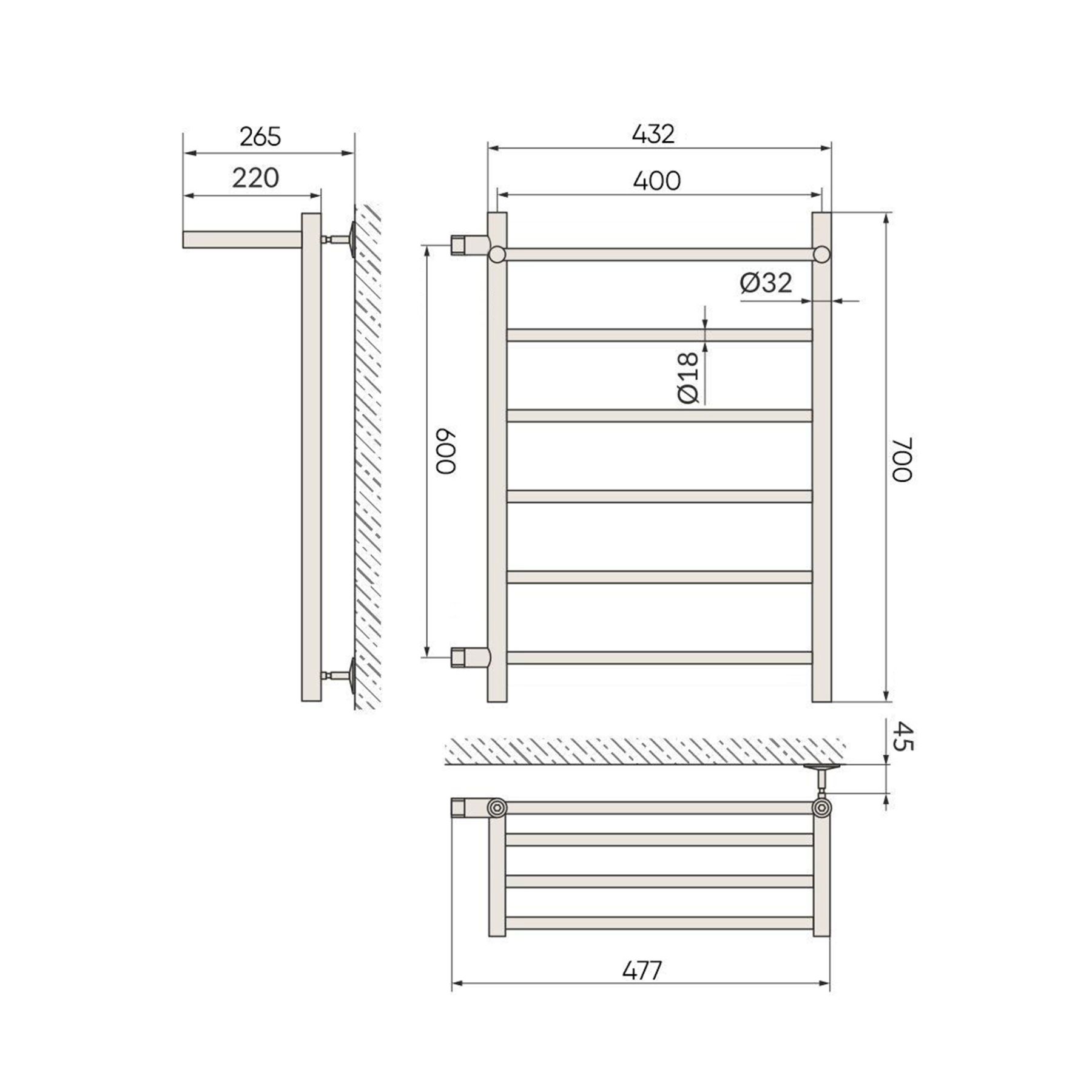 Водяной полотенцесушитель в форме Лесенки Line с полочкой – это оригинальный элемент не только с прямыми или накладными перекладинами, но и дополнительной полкой для полотенец, халатов и других мелочей.
