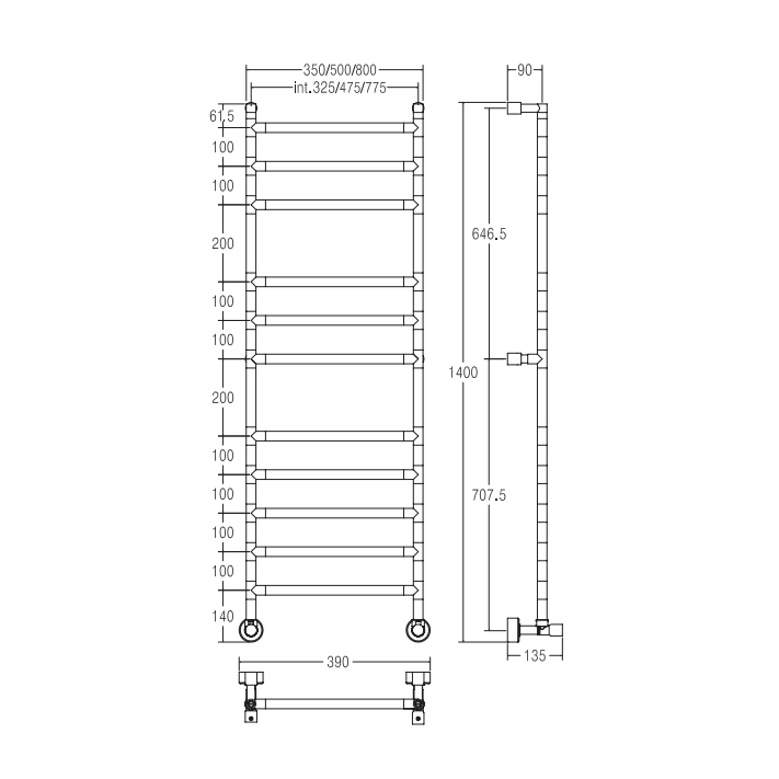 Стационарный модульный полотенцесушитель из латунной трубы диаметром Ø32мм Комбинированный версия: С однотрубным вентилем межосевое расстояние 40/50 мм