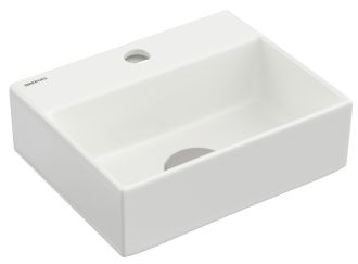 Подвесная раковина из санфарфора Berges Small размером 29х24х9 см.Прямоугольная, с отверстием под смеситель, глянцевая белая.Крепеж в комплекте.Подходит для использования на столешнице.