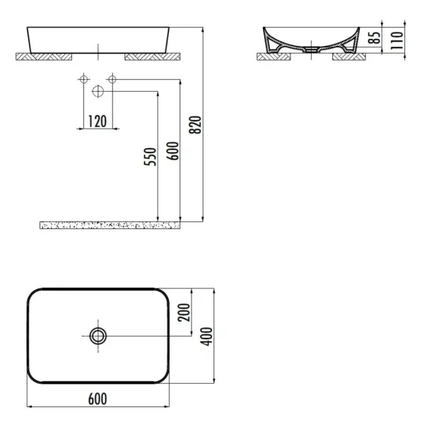 Creavit Ultra UL060-00CB00E-0000 Раковина накладная 600*400 мм (белый глянцевый). Без перелива. Без отверстия для смесителя.