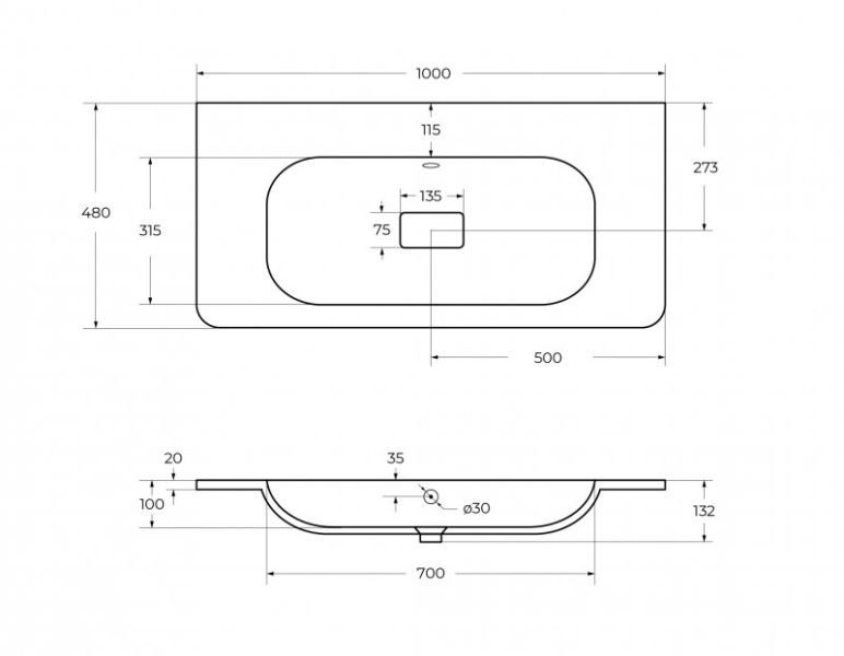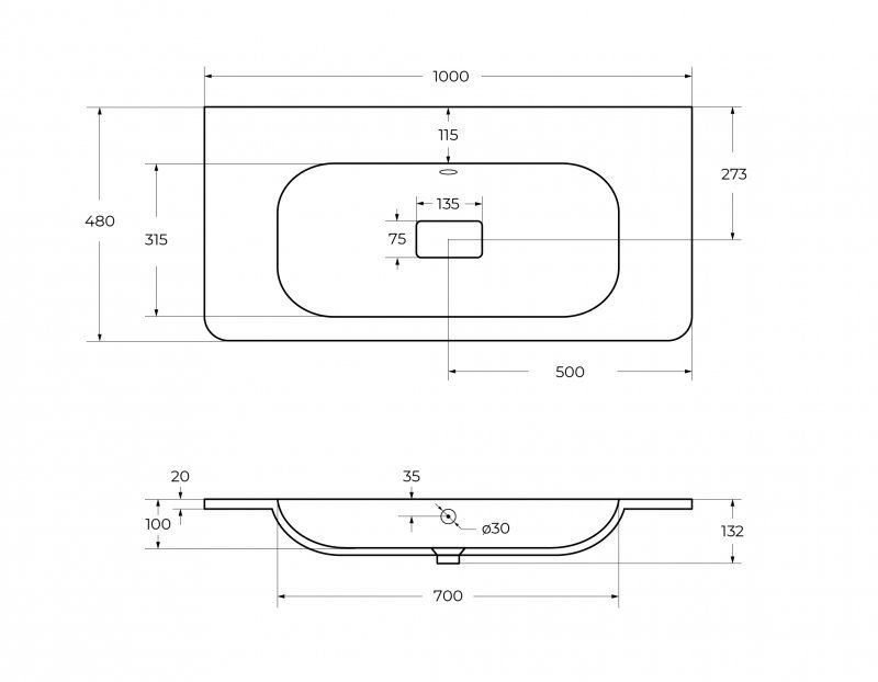 Раковина из искусственного мрамора 100 см CEZARES CZR-1000/480-LV-MR-NV-W0 без отверстия под смеситель