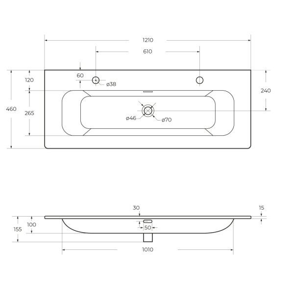 Раковина керамическая с двумя отверстиями под смеситель CEZARES 120 см, CZR-8073-120-1-2