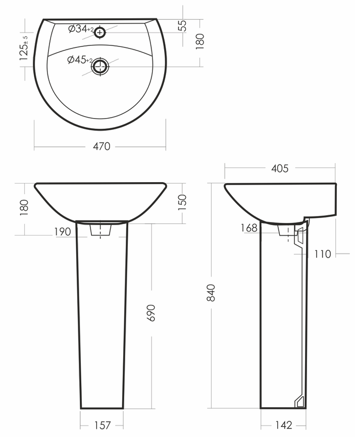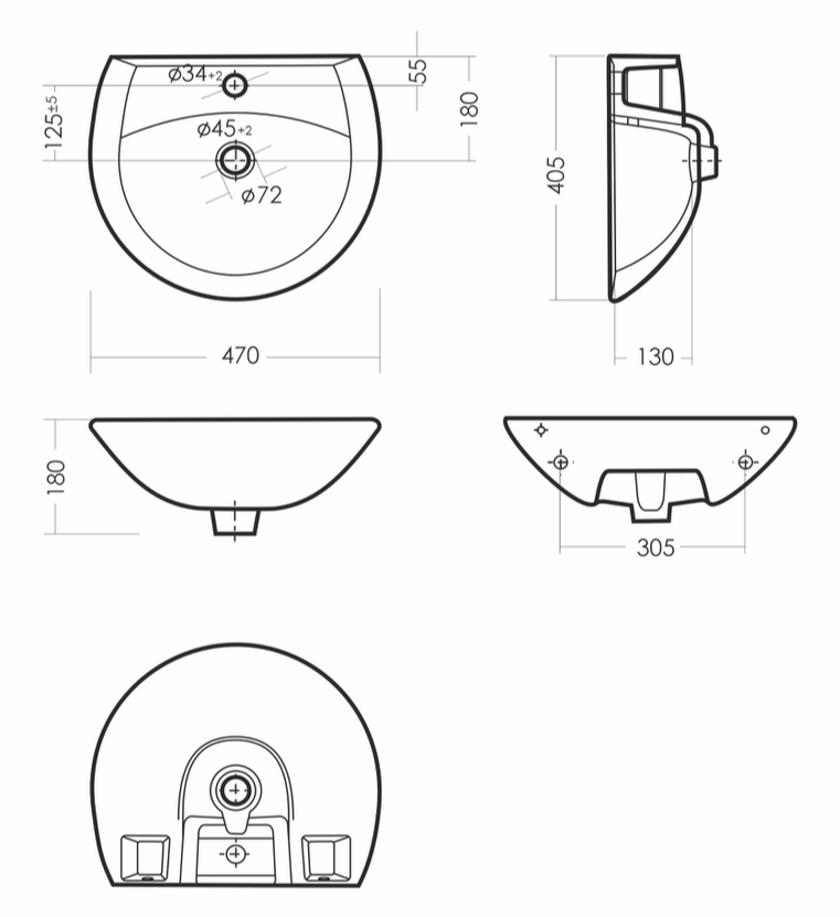 Размеры умывальника: 470 x 405 x 180