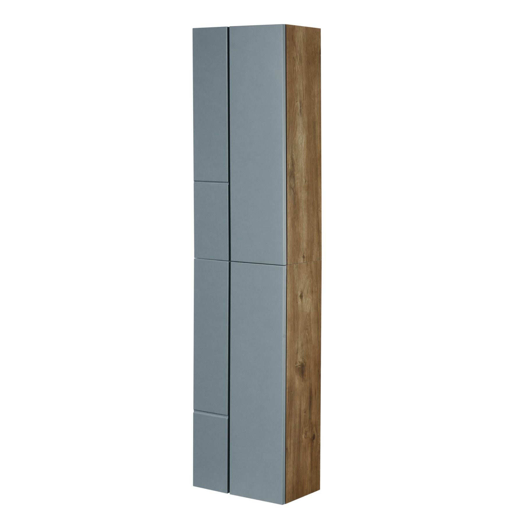 - Дизайн шкафчика повторяет тумбу-умывальник: фасады в матовой пленке фьерд сочетаются с корпусом в декоре дуб рустикальный
