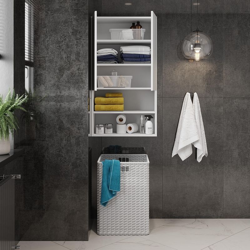 Компактные габариты позволяют грамотно организовать небольшой санузел (подвесной шкаф можно разместить над стиральной машиной), а пространство за распашными дверцами с доводчиками поможет разместить все необходимые вещи.