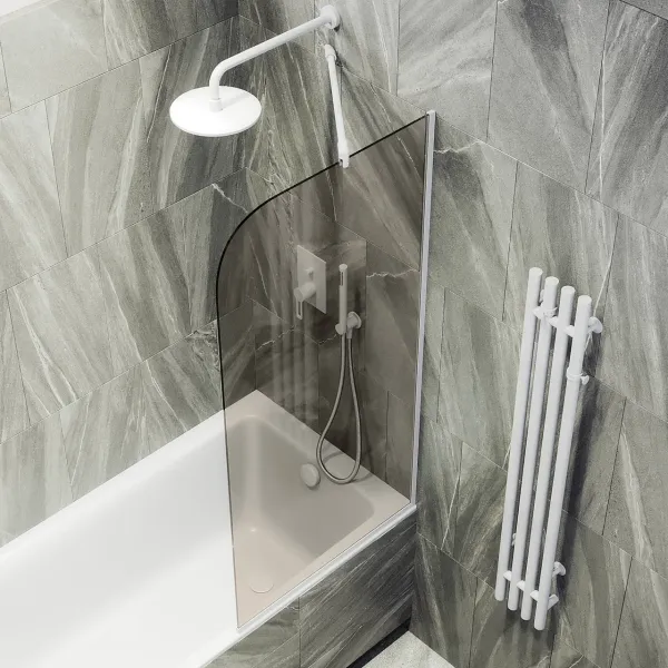 Монтаж осуществляется с помощью алюминиевого профиля, что обеспечивает надежность крепления и безопасность использования стеклянной перегородки для ванной. Также, шторка оснащена специальным уплотнителем, который предотвращает попадание воды на пол ванной комнаты. Закаленное стекло, цвет Бронза, толщина 6 мм 1400х640 мм - 1 шт.