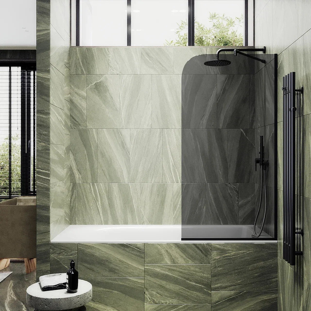 Монтаж осуществляется с помощью алюминиевого профиля, что обеспечивает надежность крепления и безопасность использования стеклянной перегородки для ванной. Также, шторка оснащена специальным уплотнителем, который предотвращает попадание воды на пол ванной комнаты. Закаленное стекло, цвет Графит,толщина 8 мм 1400х400 мм - 1 шт.