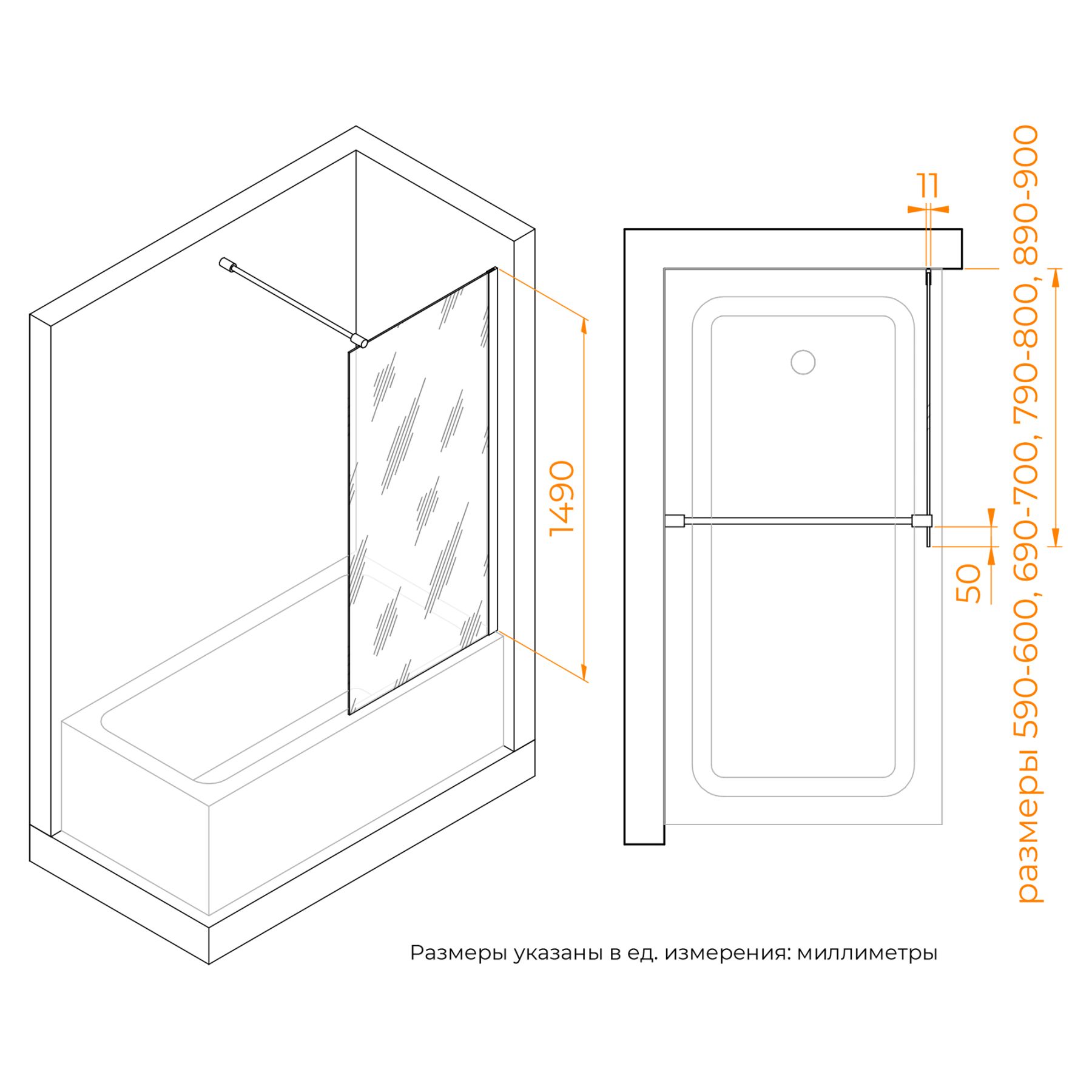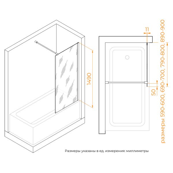 Высота шторки: 1490 мм — подходит для большинства стандартных ванных комнат.