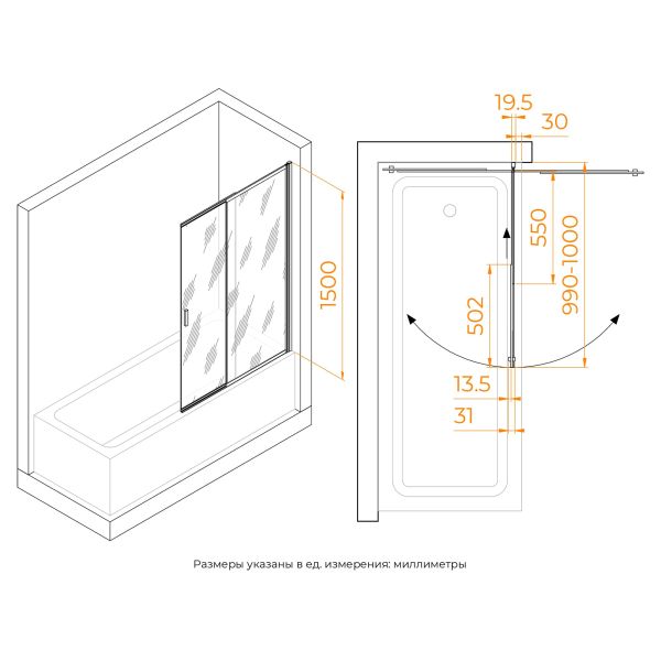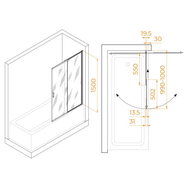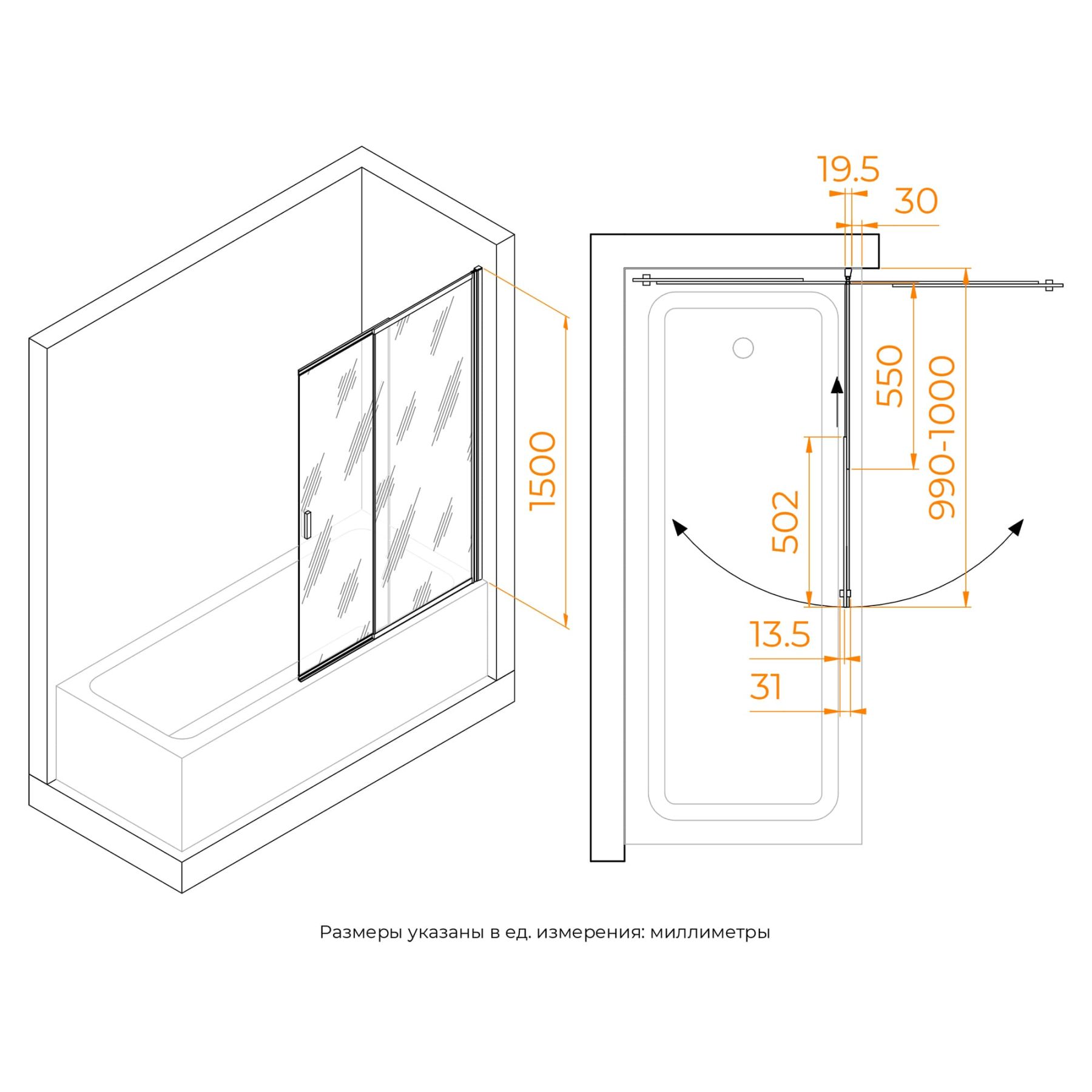 Высота: 1500 мм — максимальная защита от брызг.