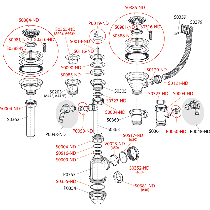 - Возможность подключения сливной трубы Ø50 мм или Ø40 мм