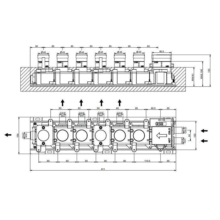 Термостат Gessi HI-FI, встроенная часть, с возможностью одновременного управления до 5-и функций, выполнен в элегантном цвете Chrome. Этот термостат является высококачественным и функциональным устройством, предназначенным для управления различными элементами душевой системы, такими как дождевой душ, ручной душ, боковые форсунки, а также дополнительными функциями, которые могут быть включены в систему. Благодаря этой модели вы получаете возможность регулировать все основные функции с одного устройства, что значительно повышает удобство и комфорт во время принятия душа.
