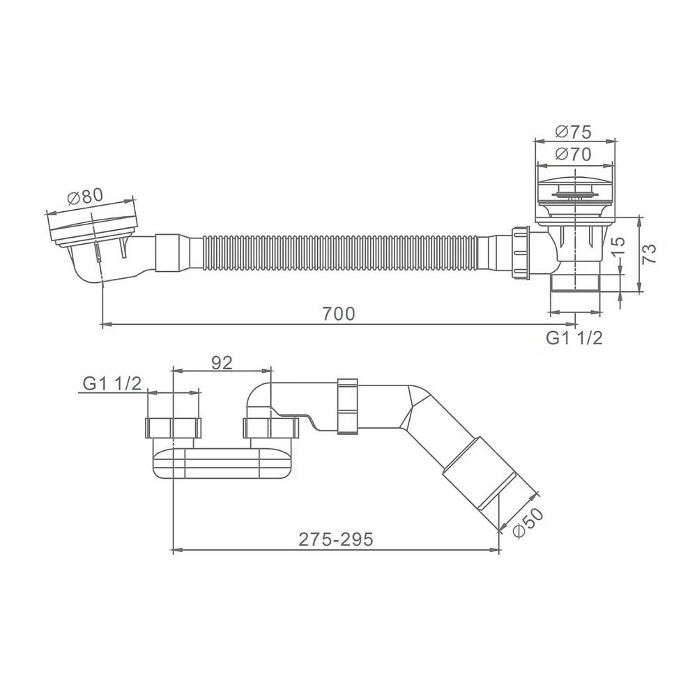 Слив-перелив 1 1/2"х40/50, с переливом и автоматическим сливом для ванн и глубоких душевых поддонов. Конструкция сифона позволяет прочищать сифон, не демонтируя его. С отводом в канализацию.