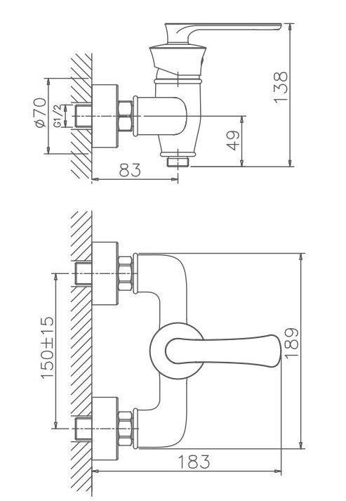 Смеситель изготовлен из латуни.Диаметр декоративных чашек 70 мм.Душевой гарнитур в комплекте.Межосевое расстояние (расстояние между выходом горячей и холодной трубы) 150 мм.Данное расстояние изменяется за счет входящих в комплект эксцентриков на 15 мм. в большую или меньшую стороны.Цвет хром.