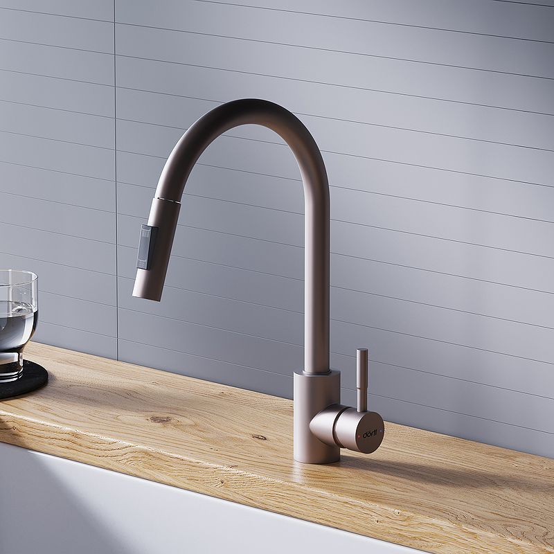 Оригинальное решение для кухни - смеситель для мойки с вытягивающимся изливом. В носике смесителя встроен вытягивающийся душ, благодаря которому так просто поддерживать гигиеническую чисоту на кухне и наполнять любые емкости! Утонченный элегантный дизайн сохранит свою актуальность на долгие годы и останется украшением на вашей кухне. Удобная эргономичная ручка-стик обеспечивает легкое управление напором воды в одно касание.