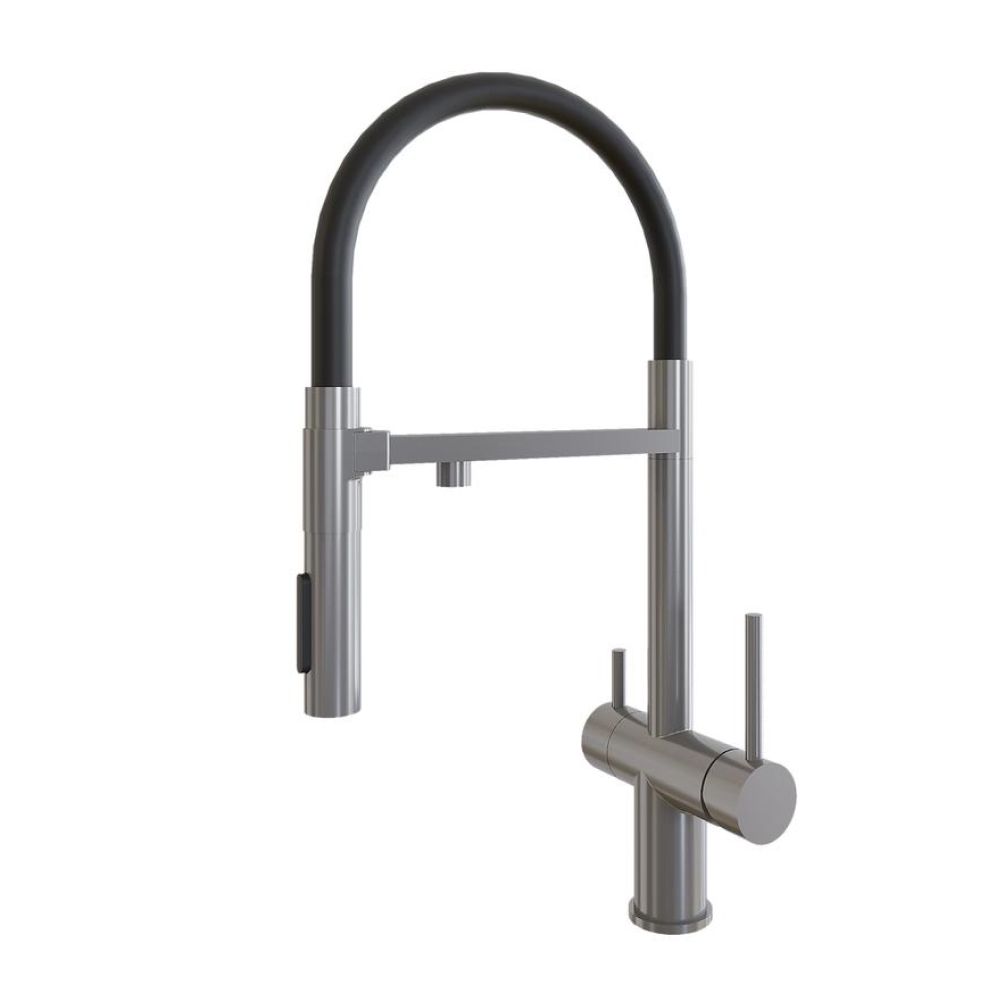 Смеситель GRANDEX AQUA CHOICE-S - современный, стильный и многофункциональный кухонный смеситель, выполненный из высококачественной латуни. В смесители использованы испанский керамический картридж Sedal 35 мм и швейцарский аэратор Neoperl.