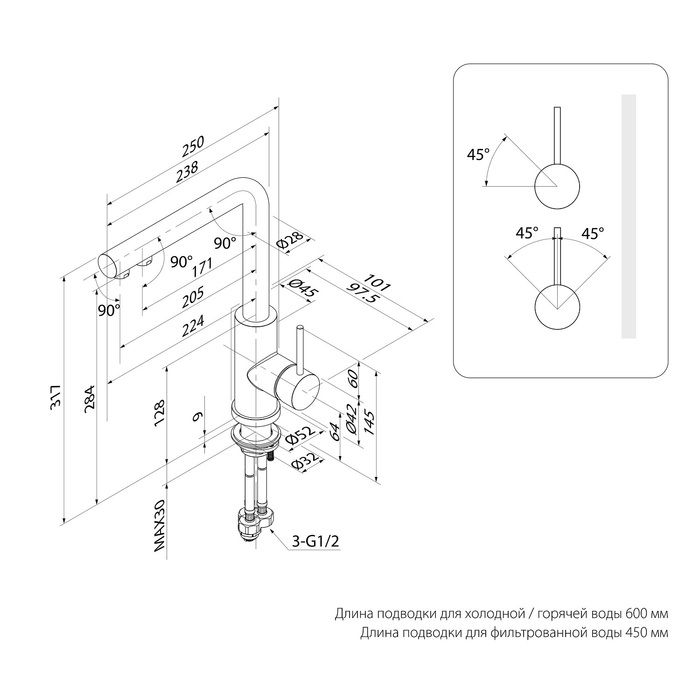 Изысканная ручка-джойстик – для включения обычной и фильтрованной воды. Угол открывания ручки – 90 градусов (45 градусов от себя – холодная вода, 45 на себя – горячая). Чтобы налить фильтрованной воды, нужно просто повернуть ручку в закрытом состоянии.