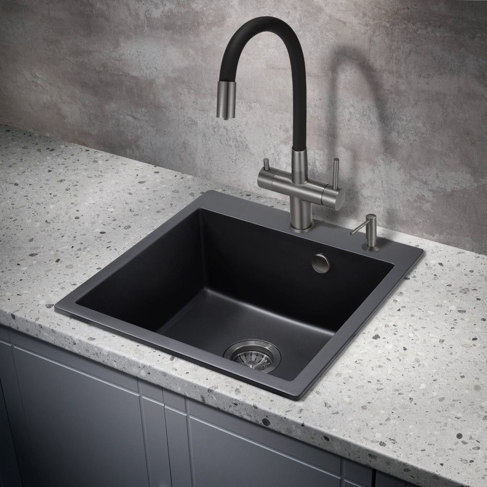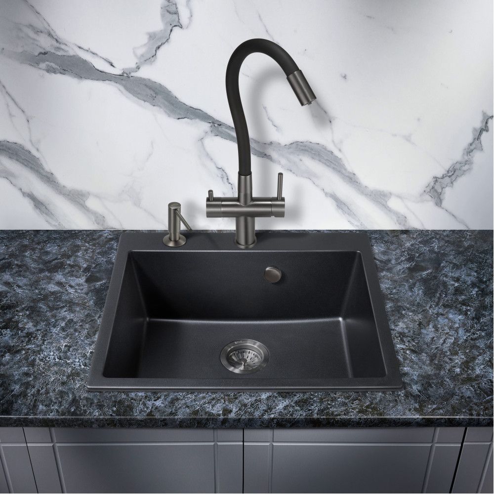 Модель выполнена в благородном цвете вороненая ( оружейная ) сталь и имеет изящный излив черного цвета, благодаря чему станет яркой, привлекающей внимание деталью на кухне и никого не оставит равнодушным.