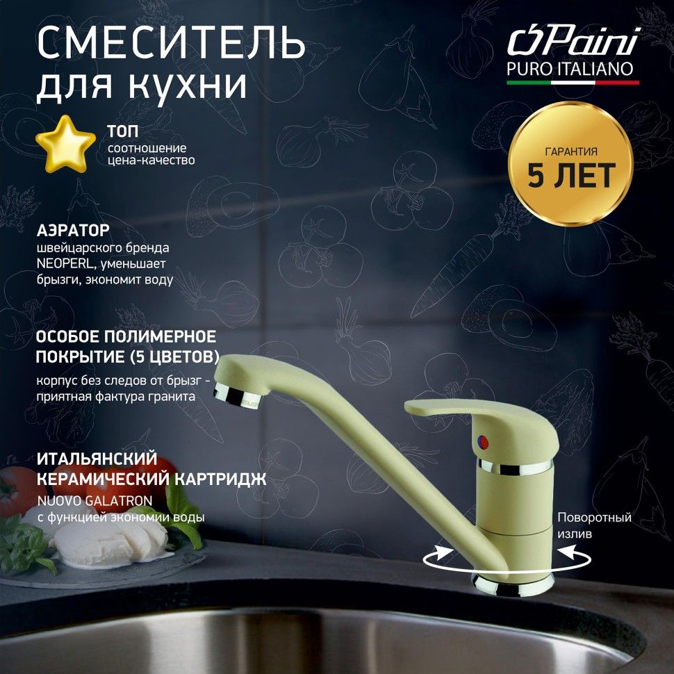 Все дело в цвете! Интересное решение для любителей традиционных моделей смесителей для кухни – PAINI JOLLY. Однорычажный смеситель с поворотным изливом обладает обтекаемой формой, знакомой и привычной многим. В этот раз этот популярный смеситель представлен в необычных цветах, что дает простор творчеству и позволяет сочетать его с мойками и кухонной мебелью разных фактур и материалов.Разнообразие цветаБелый с вкраплениями (гранит), комбинация черного и хромого цветов в корпусе смесителя, и три варианта бежевого цвета: сахара, бежевый с вкраплениями (гранит) и нежный трюфель. Теперь точно получится попасть в цвет столешницы и/или цвет мойки либо создать контрастные сочетания. Все варианты покрытия выполнены по специальной технологии, сохраняющей цвет и фактуру надолго и облегчающей уход за смесителем.Европейское качествоСделано в Италии. Гарантия – 5 лет.Технологии гарантируют долгий срок службыАэратор Neoperl наполняет поток воды кислородом, увеличивает напор, экономя воду. Одно движение пальцем для очистки сеточки. Nuovo Galatron - керамический картридж – основа, необходимая для долгой работы смесителя.Легкая уборкаМыльная губка и сухая тряпочка – все, что нужно для уборки. Несколько движений – и готово.