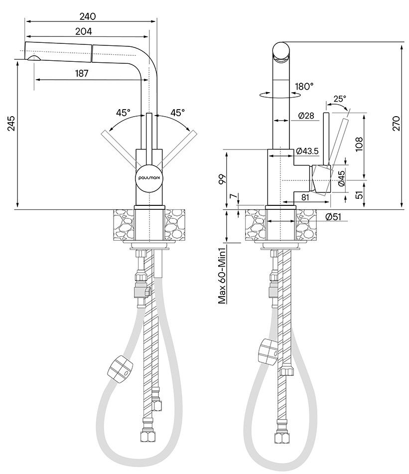 Смеситель для кухни с выдвижным шлангом, Ka214311-310Изготовлен из высококачественной латуни, которая отвечает высочайшим европейским стандартам качества, не содержит свинца, не разрушается со временем и безопасна для здоровья.Вытяжной шланг