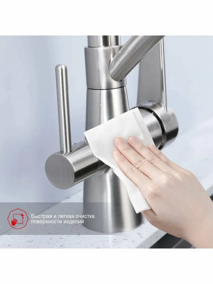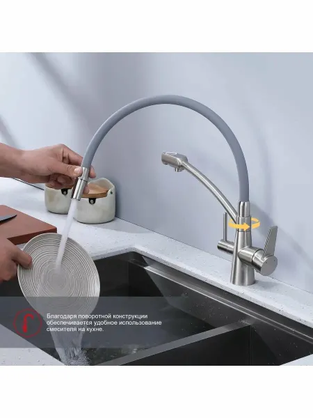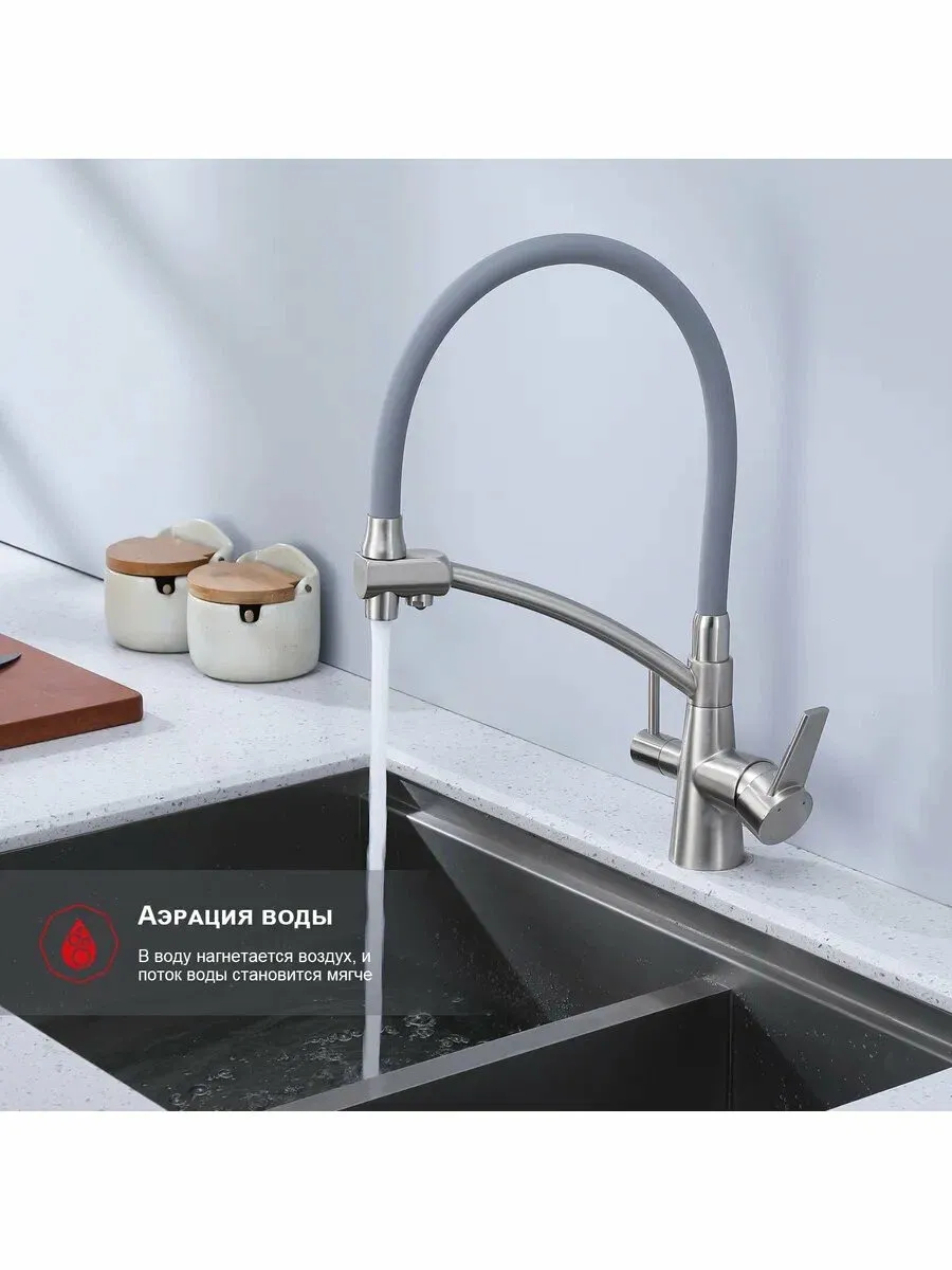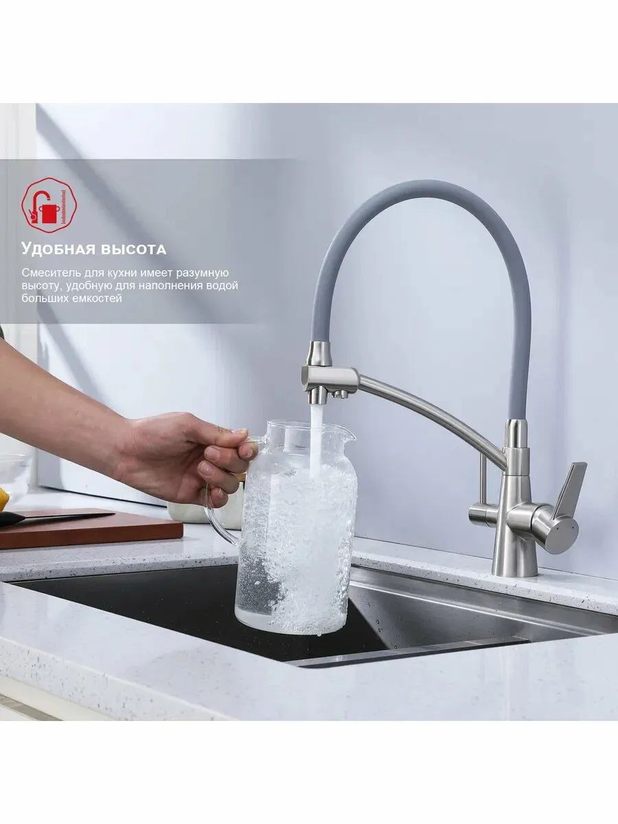 Смеситель для кухни с питьевым фильтром имеет подводку для холодной и горячей воды, а также фильтр для очистки воды, что обеспечивает высокое качество воды и защищает смеситель от засорения. Этот смеситель для кухни с фильтром для питьевой воды отлично подойдет для любой раковины или умывальника.