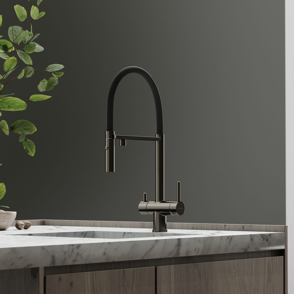 Смеситель для кухни SANCOS Imola с гибким изливом и возможностью подключения фильтра для воды, цвет вороненая сталь, арт. SC4010GGФункция "Холодный старт" - при включении смесителя активируется холодной поток, для экономии горячей водыАэратор, гибкая подводка, ключ и крепления для монтажа