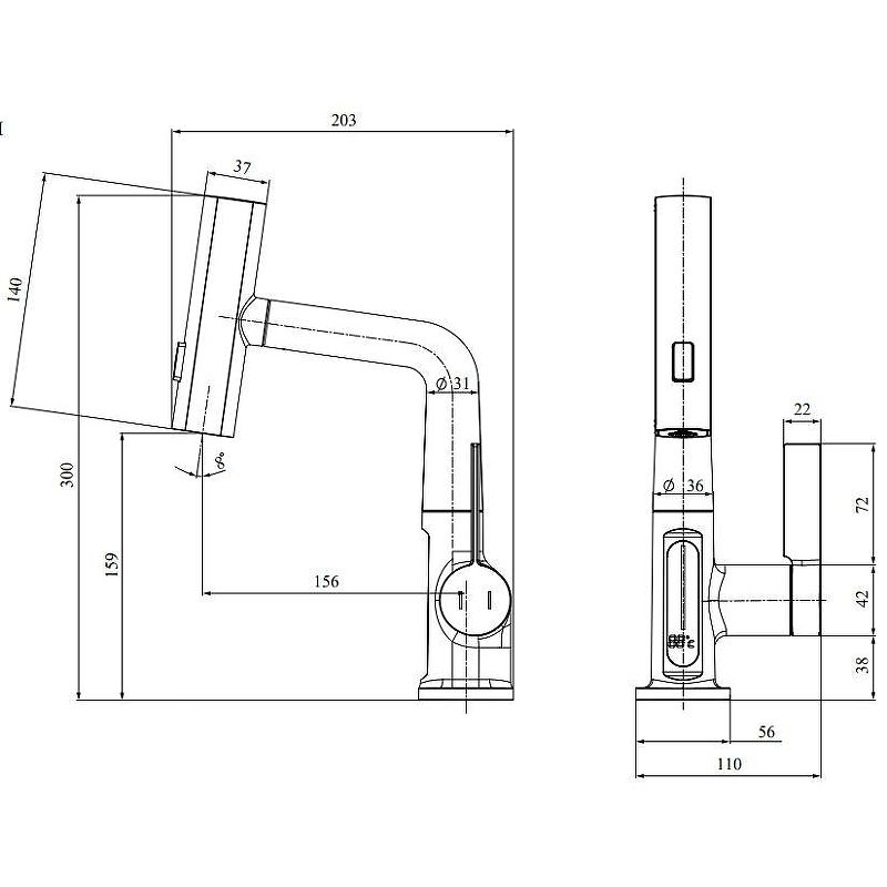 Смеситель для раковины датского производителя Black&White в цвете оружейная сталь. Корпус изделия выполнен из сантехнической латуни для увеличенного запаса прочности, а также исключает возможность появление коррозии. Управление потоком воды осуществляется с помощью керамического картриджа повышенной пропускной способности. Инновационным решением можно отметить электронное табло, расположенное в нижней части корпуса, на которое выводится показание температуры воды с подсветкой красного, зеленого и синего цвета. В данном продукте реализован многофункциональный излив с возможностью настройки высоты и длинны с помощью вытяжного шланга. Аэратор смесителя оборудован несколькими видами подачи воды, которые переключаются с помощью кнопки, расположенной сверху корпуса.