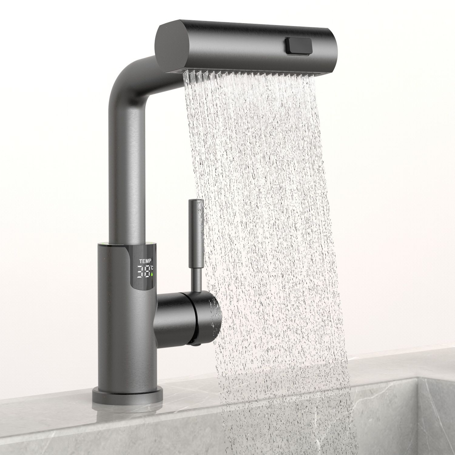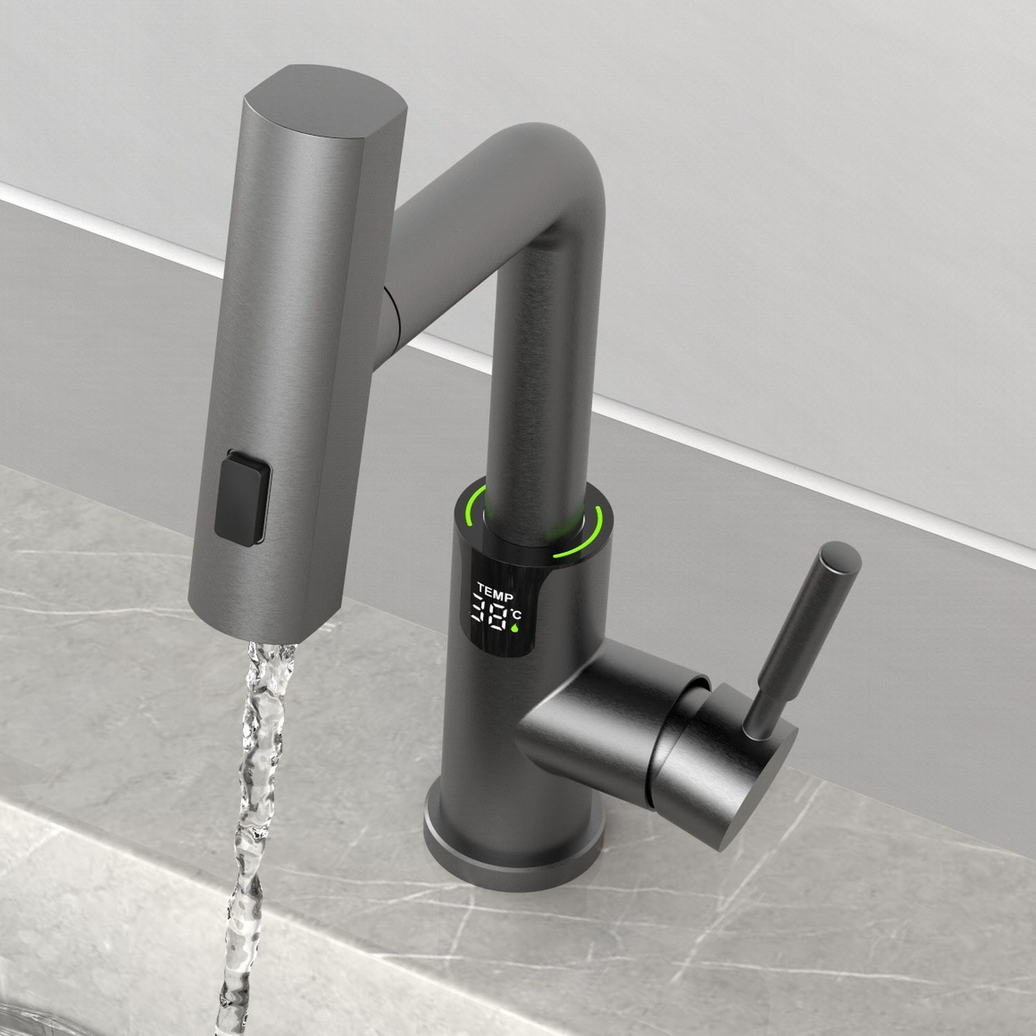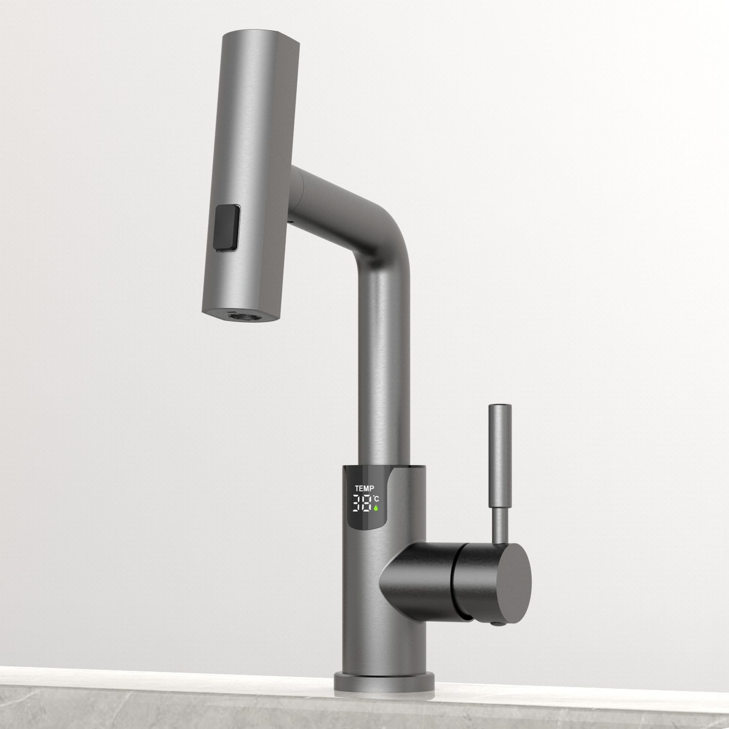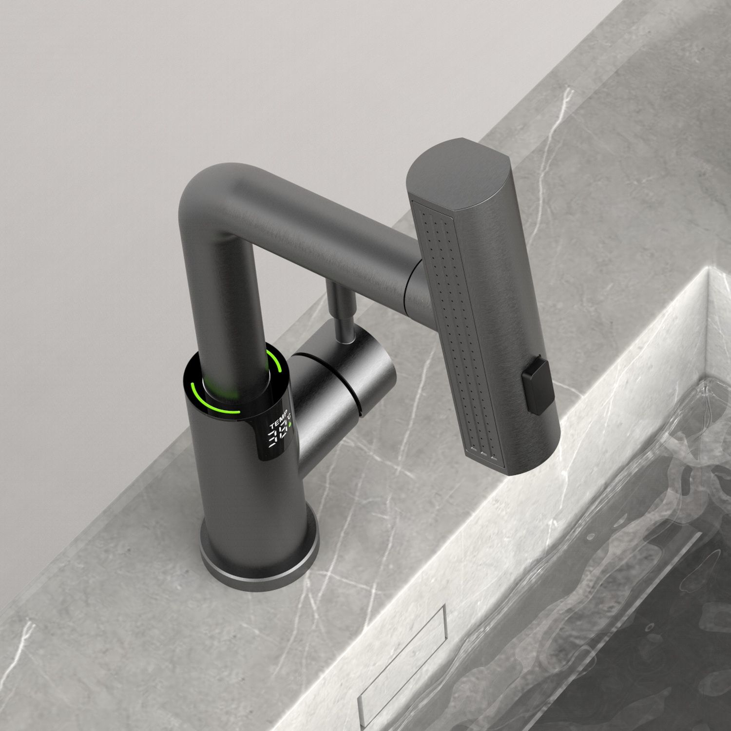Смеситель для раковины датского производителя Black&White в цвете оружейная сталь. В корпусе изделия прослеживаются нотки классических форм и современного стиля. Изготавливается из сантехнической латуни для увеличенного запаса прочности и исключения вероятности появление коррозии. Управление потоком воды осуществляется с помощью керамического картриджа повышенной пропускной способности. Инновационным решением можно отметить электронное табло, расположенное в нижней части корпуса, на которое выводится показание температуры воды с подсветкой красного, зеленого и синего цвета. В данном продукте реализован многофункциональный излив с возможностью настройки длинны с помощью вытяжного шланга. Аэратор смесителя оборудован несколькими видами подачи воды, которые переключаются с помощью кнопки расположенной сверху корпуса.