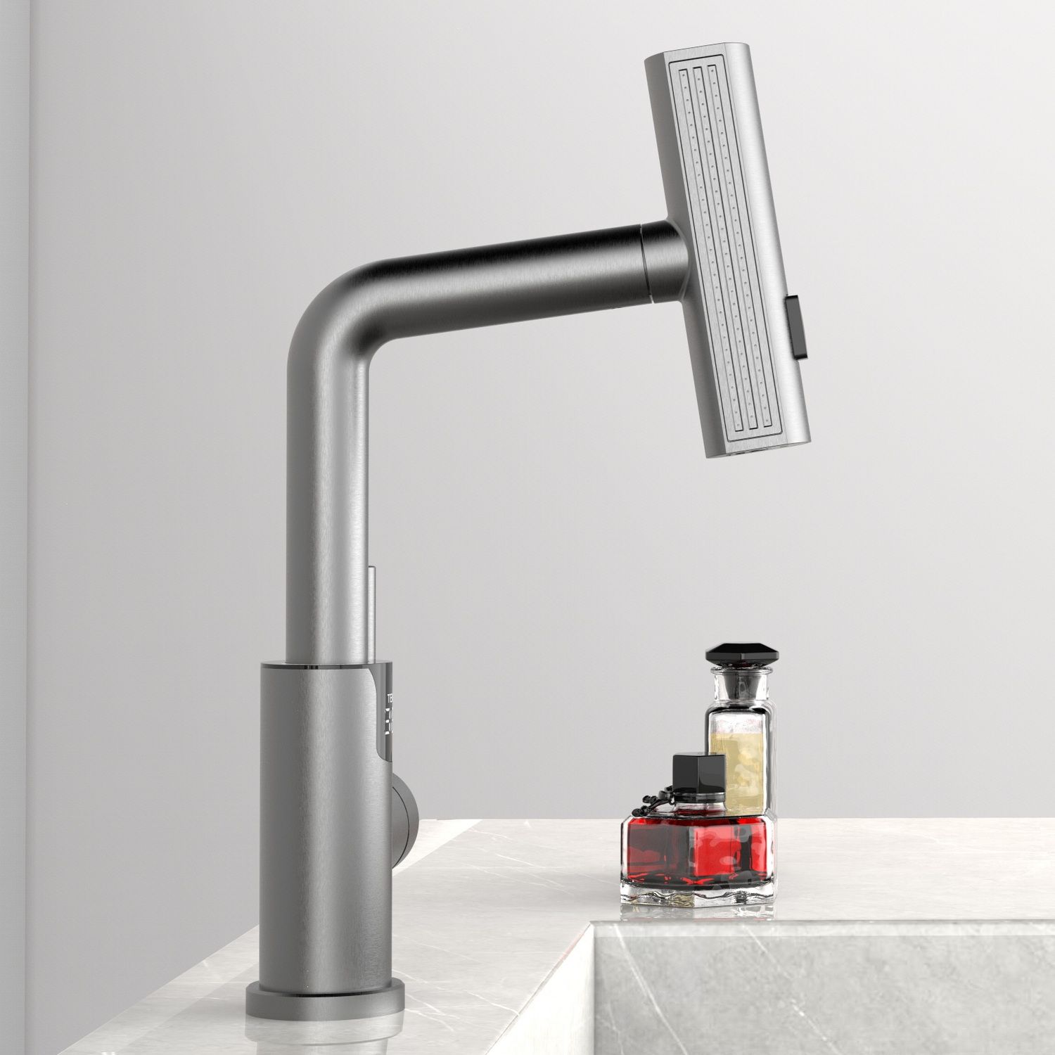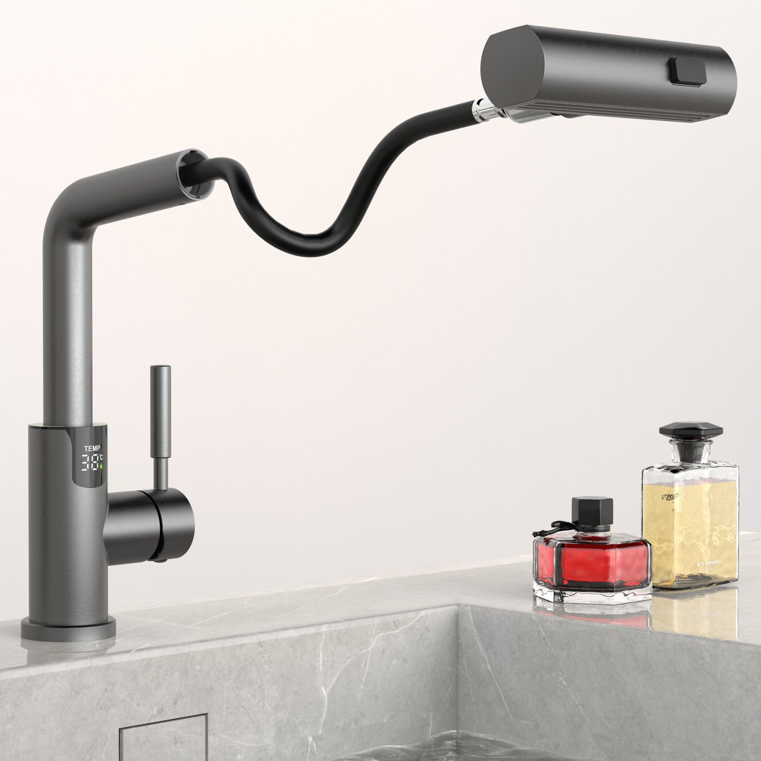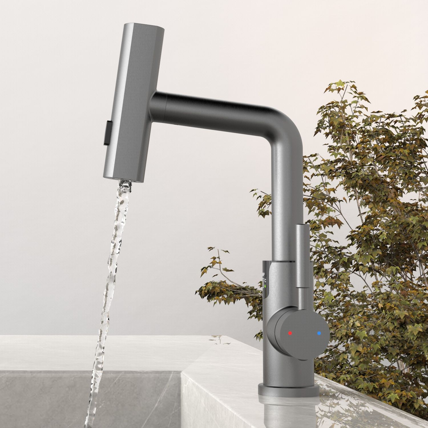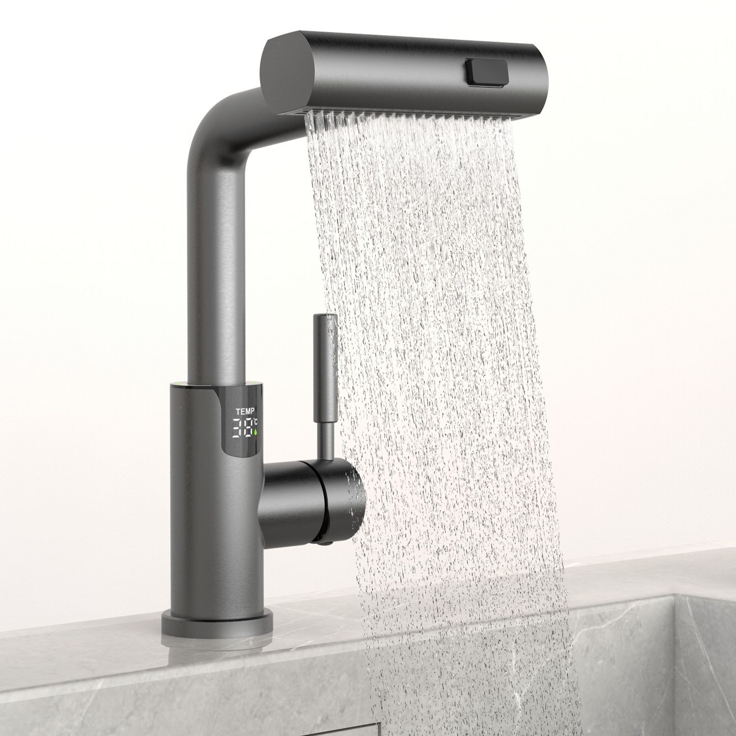 Смеситель для раковины датского производителя Black&White в цвете оружейная сталь. В корпусе изделия прослеживаются нотки классических форм и современного стиля. Изготавливается из сантехнической латуни для увеличенного запаса прочности и исключения вероятности появление коррозии. Управление потоком воды осуществляется с помощью керамического картриджа повышенной пропускной способности. Инновационным решением можно отметить электронное табло, расположенное в нижней части корпуса, на которое выводится показание температуры воды с подсветкой красного, зеленого и синего цвета. В данном продукте реализован многофункциональный излив с возможностью настройки длинны с помощью вытяжного шланга. Аэратор смесителя оборудован несколькими видами подачи воды, которые переключаются с помощью кнопки расположенной сверху корпуса.