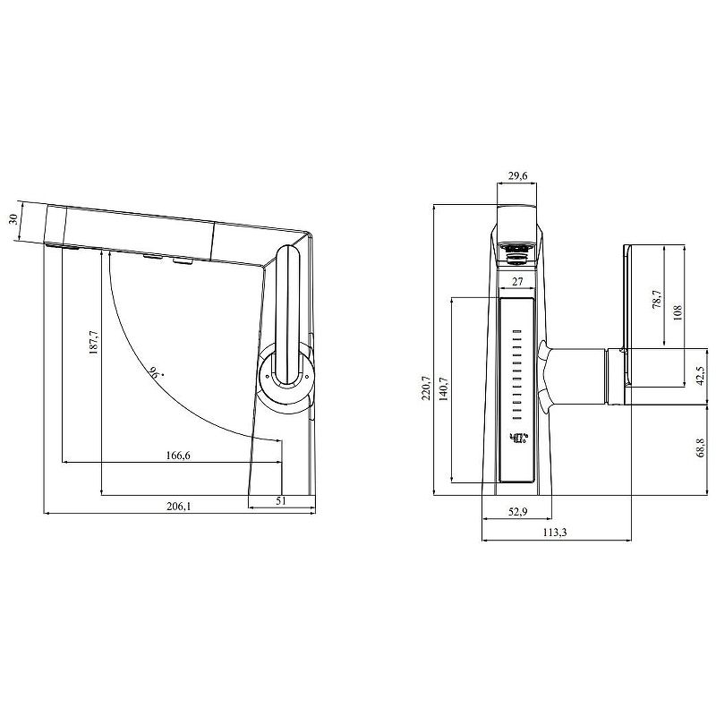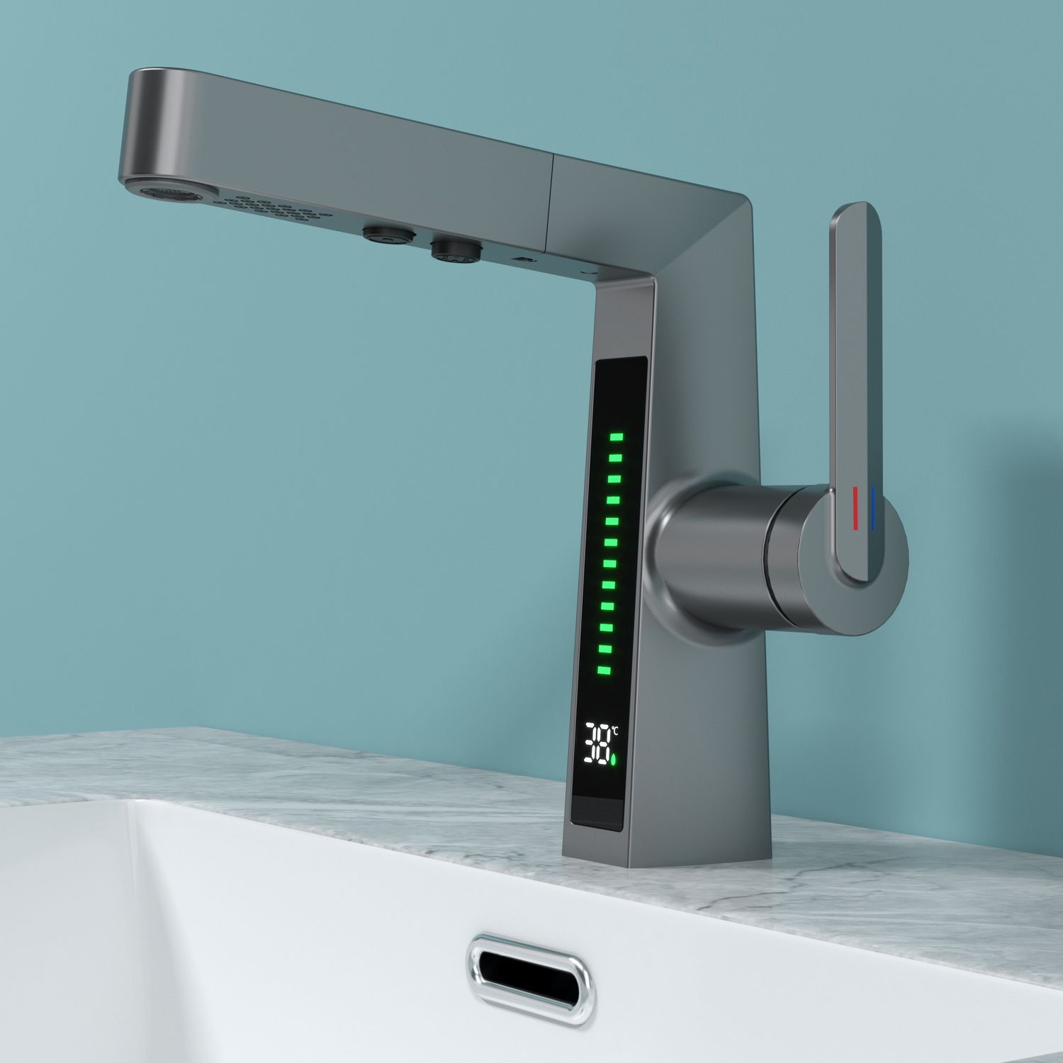 Смеситель датского производителя Black&White в цвете оружейная сталь. Изделие реализовано в минималистичном дизайне и изготовлено из сантехнической латуни, что увеличивает срок службы и исключает возможность появления коррозии. В нижней части корпуса расположен дисплей с показаниями температуры воды с соответствующей подсветкой температурного режима. Для его работы не требуется электричество- он работает от машины постоянного тока, при прохождении через него потоков воды. Управление происходит через керамический картридж большой пропускной способности. Важным функциональным элементом можно отметить вытяжной излив с поворотным аэратором, на котором также дополнительно есть функция изменения поток воды.