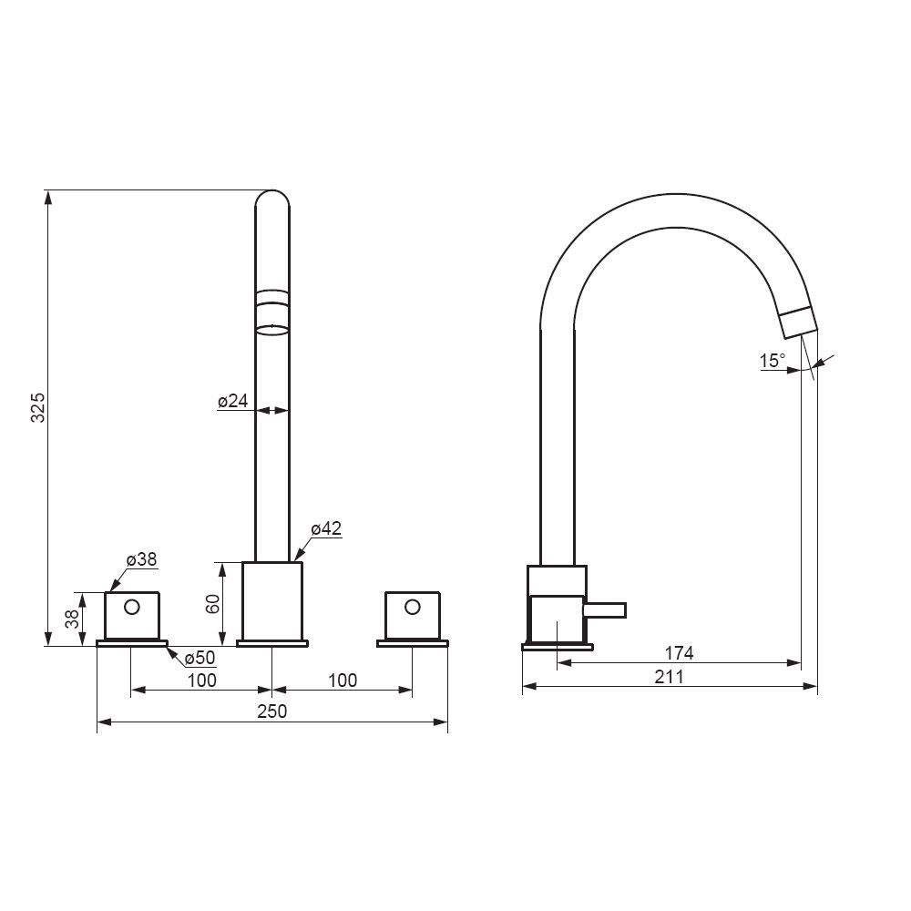 Корпус смесителя 3 шт.; излив 1 шт.; ручка 2 шт.; комплект соединения 1 шт.; гибкая подводка 2 шт.; инструкция изделия. Черный, врезной смеситель на раковину, состоит из трех отдельных секций, горячая и холодная вода поступает из отдельных секций, температура воды регулируется отдельными ручками независимо друг от друга, как на ретро смесителях