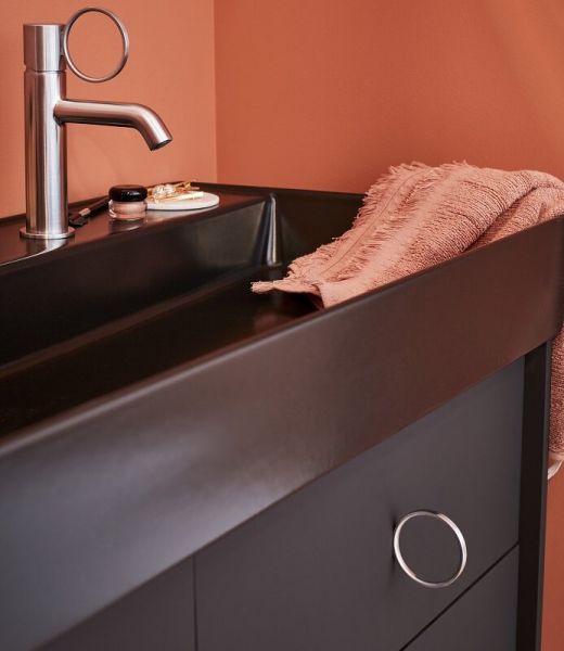 Кран, созданный как ювелирное изделие: эффектная ручка размера XXL. Идеально сочетающиеся друг с другом смесители и мебель. Модный угловой излив, который обеспечивает хорошую проекцию воды.