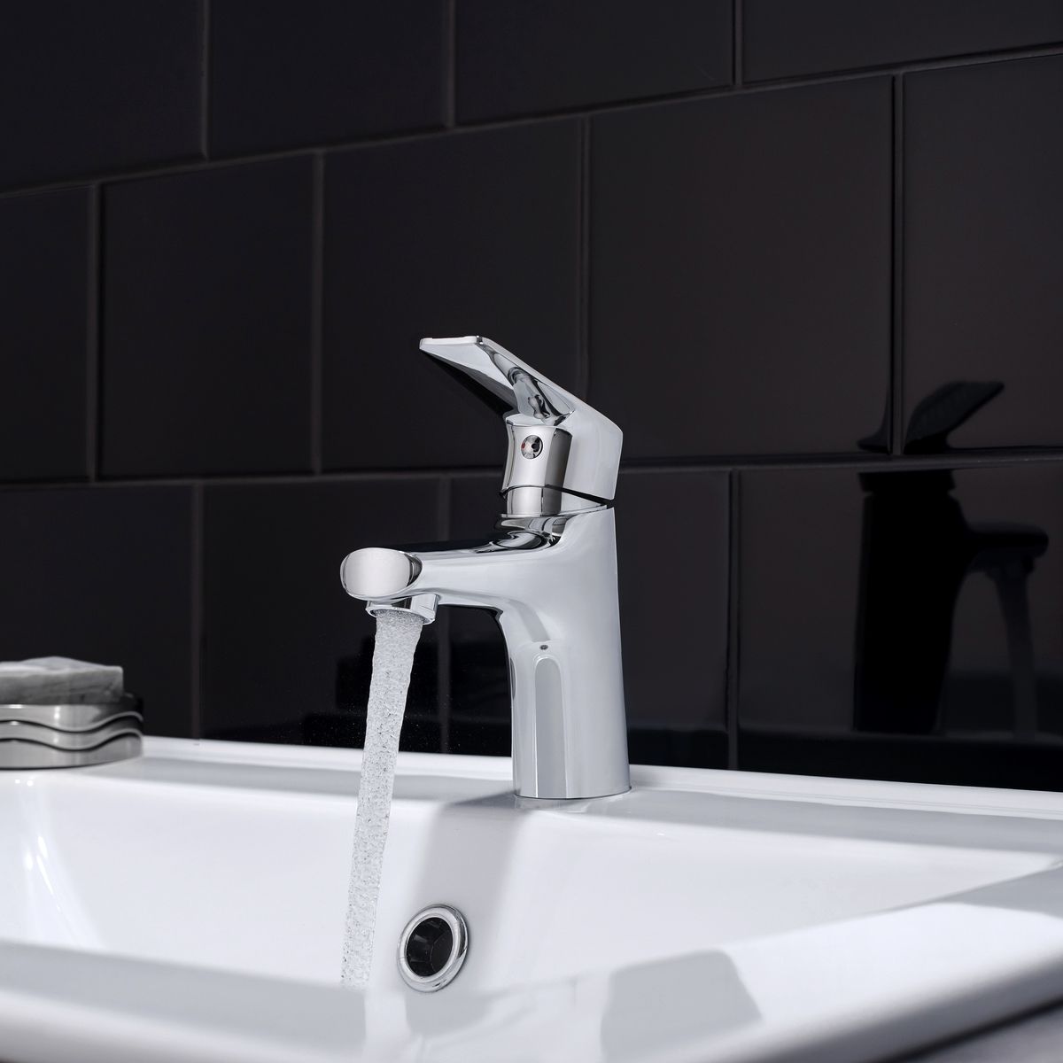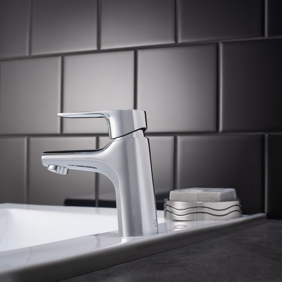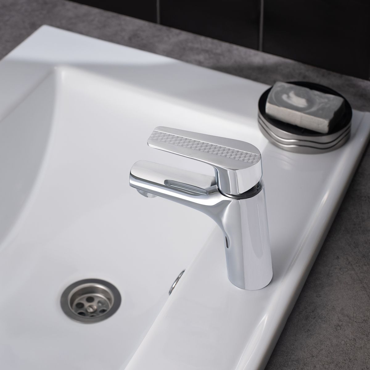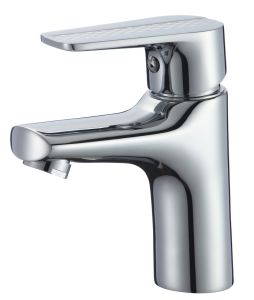Компактный однорычажный смеситель для умывальника отлично подойдет для негабаритной раковины. Ручка смесителя украшена оригинальным дизайнерским решением.
