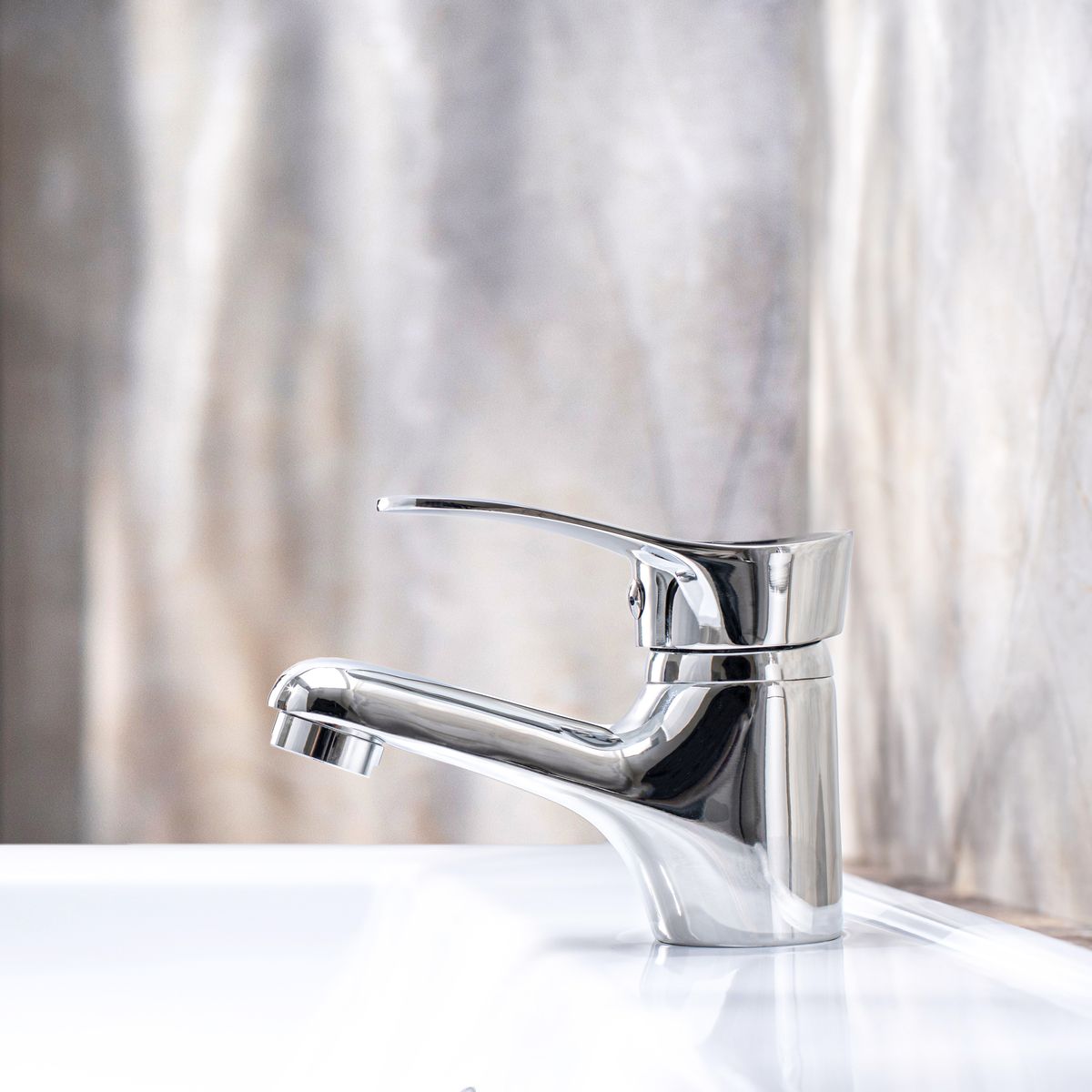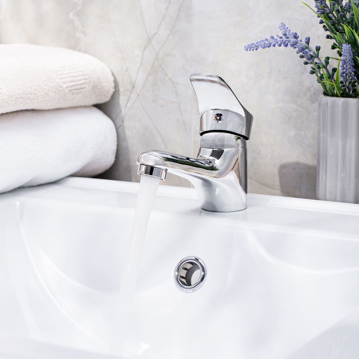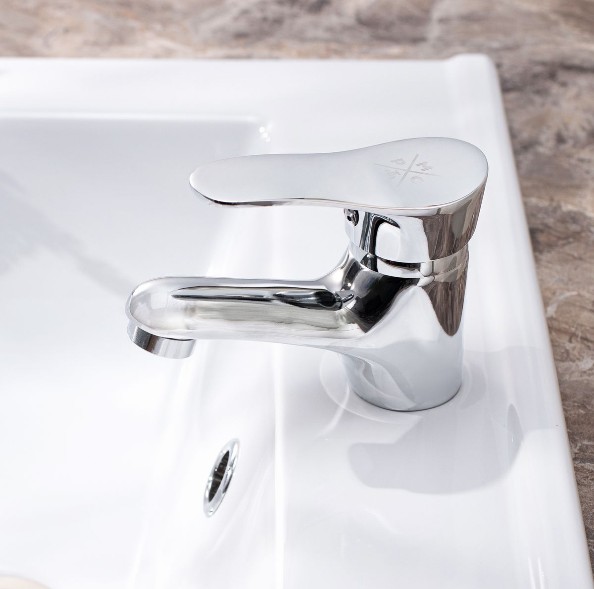 Аккуратный однорычажный смеситель для умывальника с округлыми очертаниями форм идеально подойдет для негабаритной раковины.