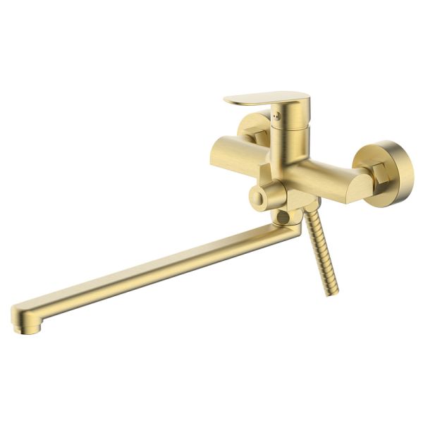 Аланти - Смеситель для ванны с ручным душем, длинный излив, золото матовое