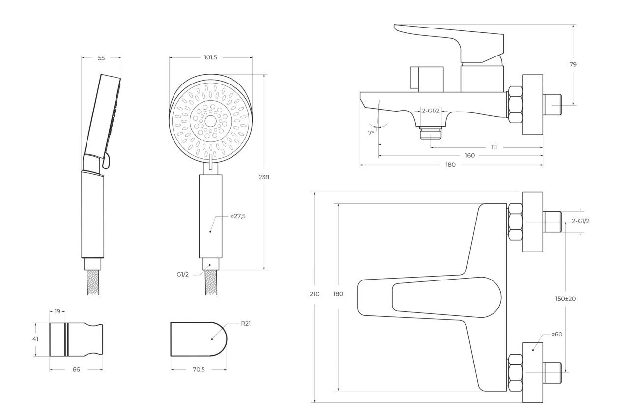 Смеситель для ванны и душа в комплекте с ручным душем, шлангом и держателем BelBagno ANCONA-VAS/DFS-CRM