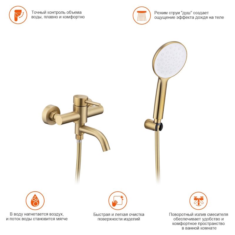 Излив смесителя оснащен аэратором, который обогащает воду воздухом, создавая мягкий и ровный поток. Широкая душевая лейка из ABS-пластика с режимом струи "душ" создает ощущение эффекта дождя на теле.