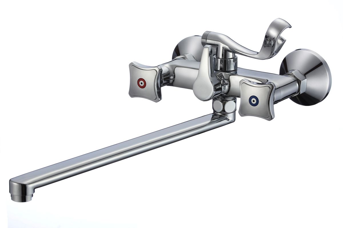 Двуручковый смеситель для ванны и душа с длинным поворотным изливом обладает стильными и удобными в использовании ручками регулирования температуры и напора воды.