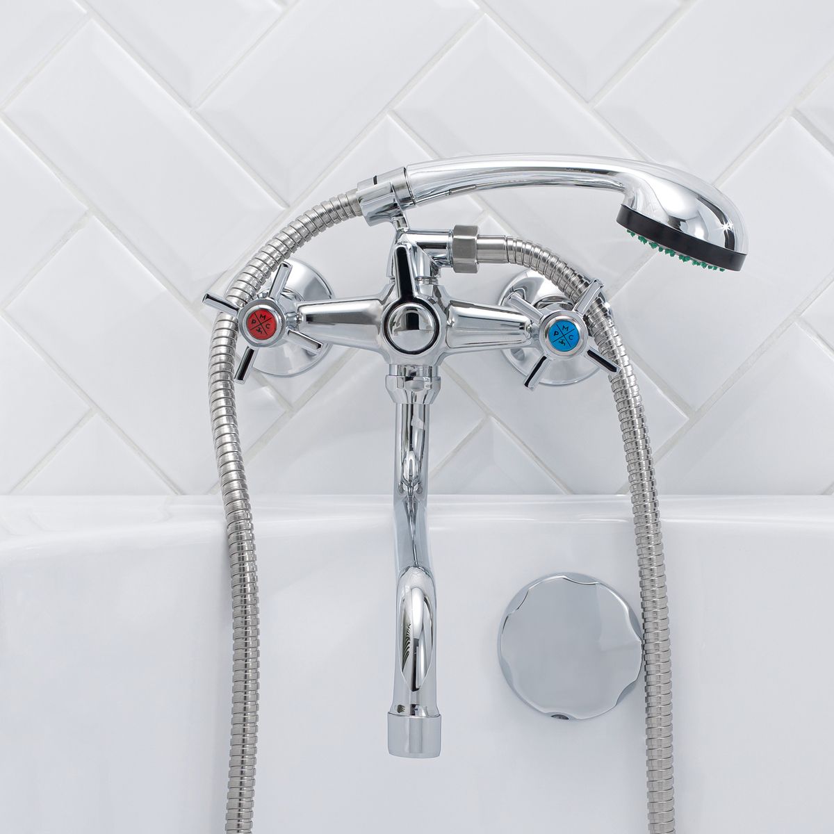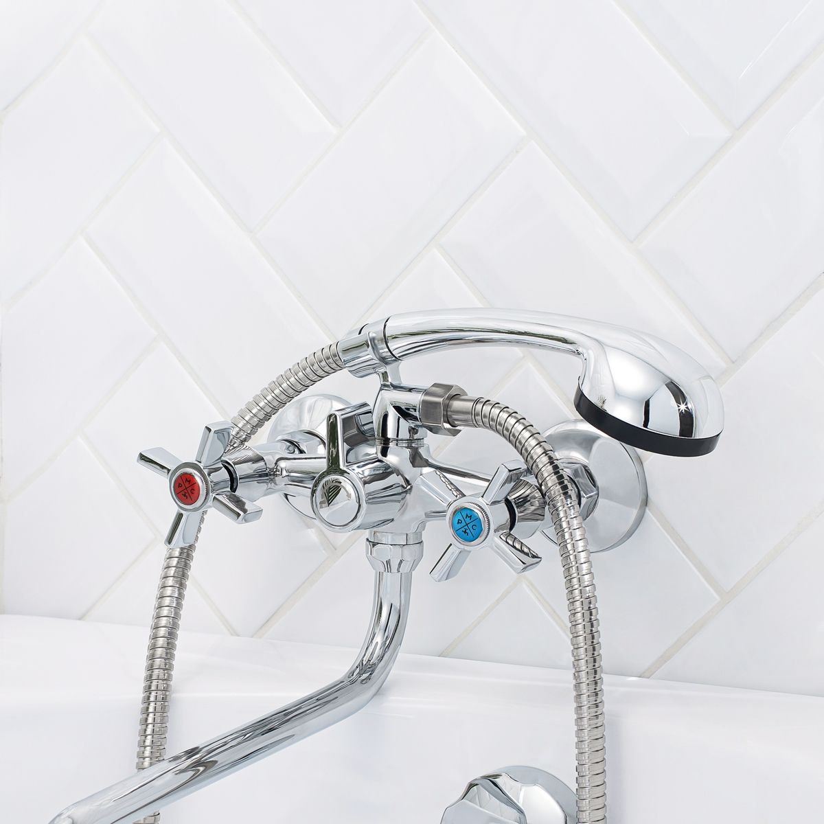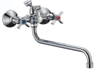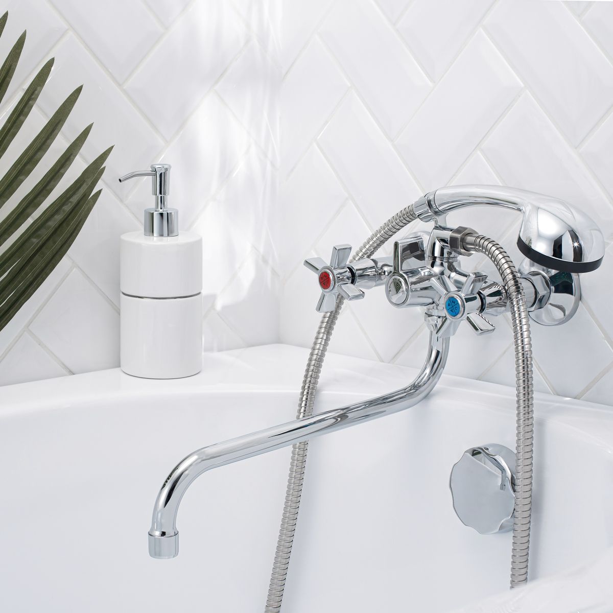 Настенный двуручковый смеситель для ванны с длинным поворотным изливом станет надежным и стильный элементом любой ванной комнаты.