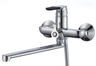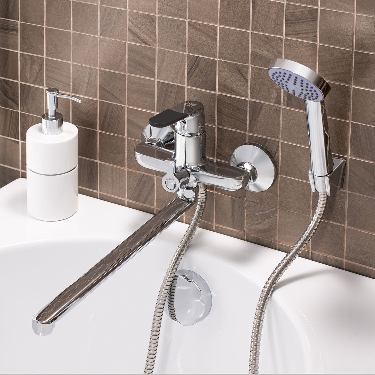 Смеситель для ванны с длинным поворотным изливом — прекрасный пример сочетания современного стиля и качества вне времени.