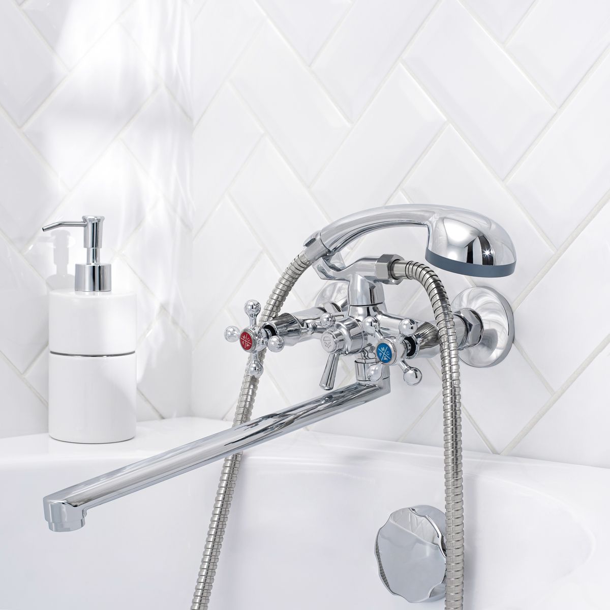 Четкие линии, стильные формы двуручкового смесителя для ванны с длинным поворотным изливом станут настоящим украшением вашего интерьера.