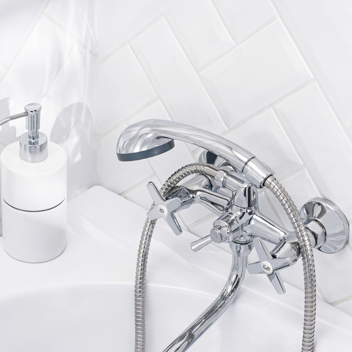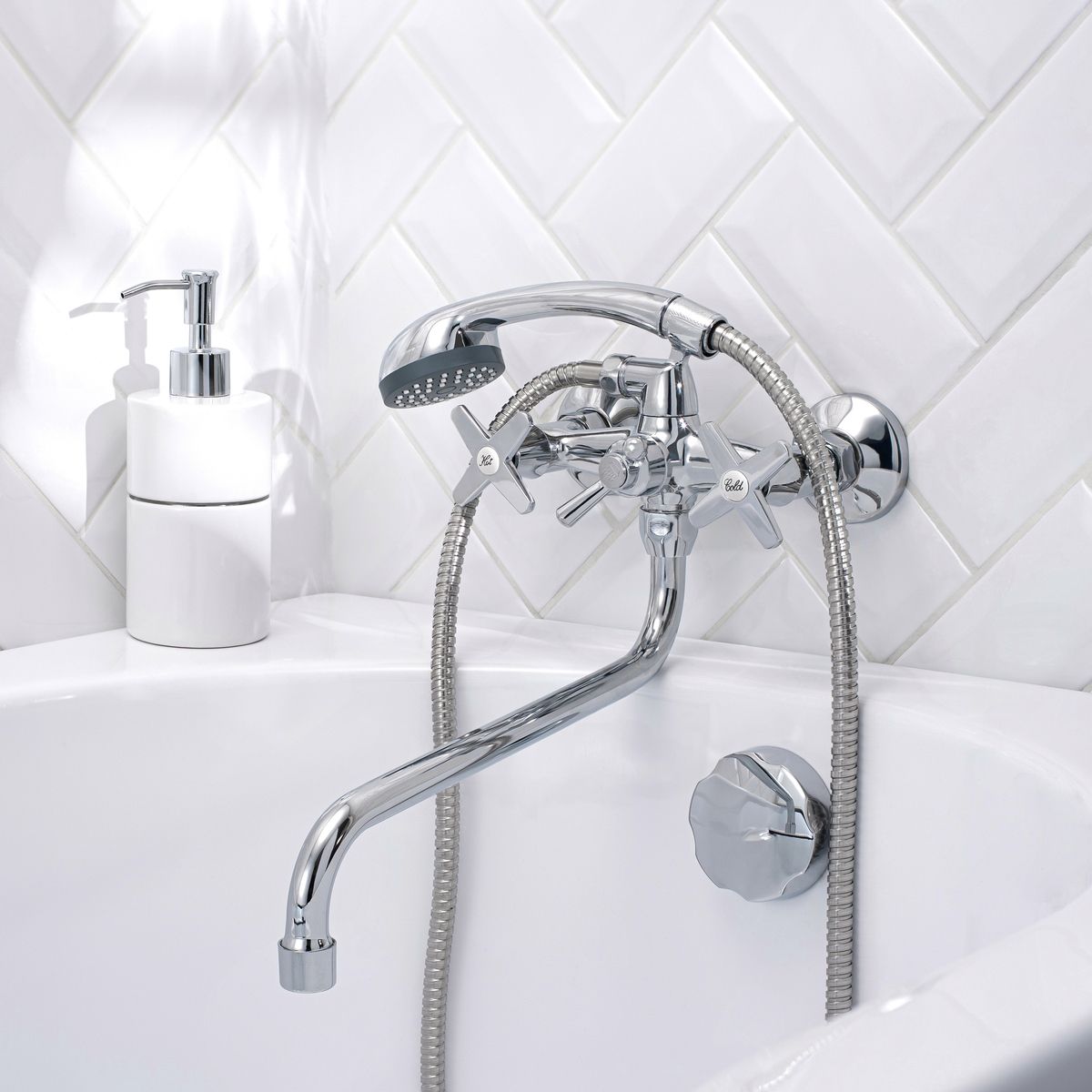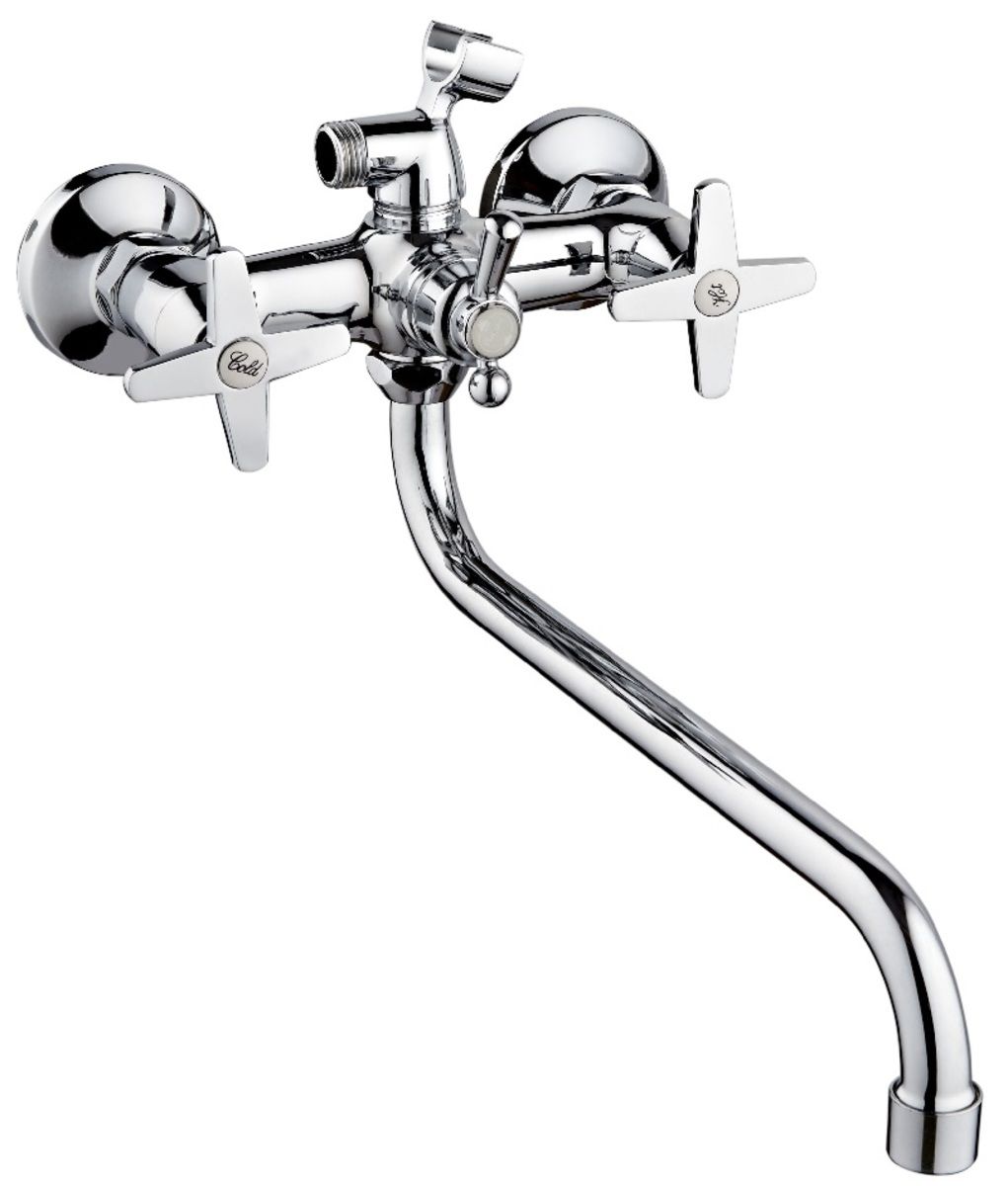Оригинальный двуручковый смеситель для ванны. Длинный поворотный излив делает модель универсальной, позволяя использовать ее для обеспечения водой как ванны, так и раковины.