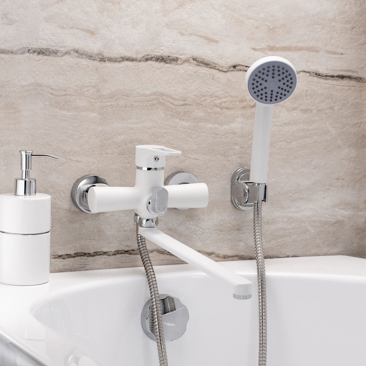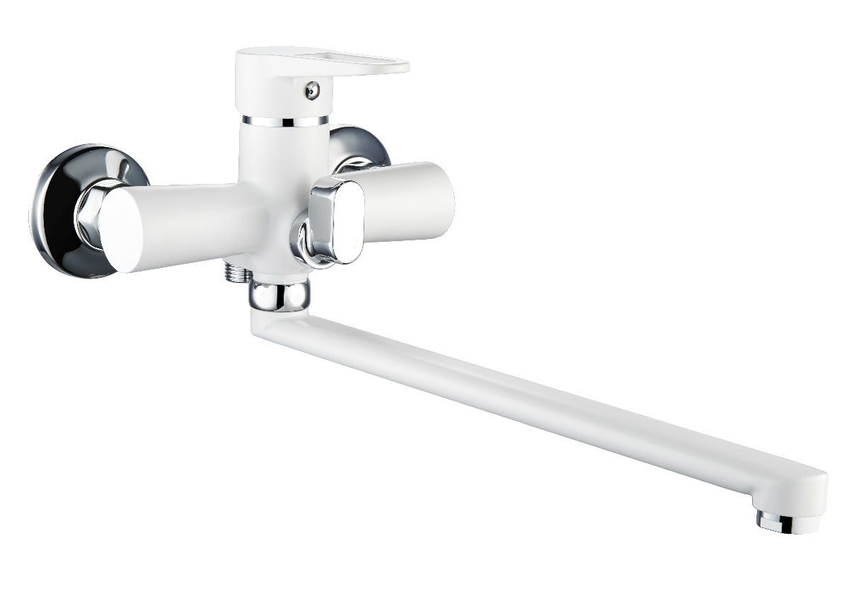 Однорычажный смеситель для ванны с длинным изливом -это сочетанием классических линий в модном белом оттенке, которое станет эффектным дизайнерским элементом вашего интерьера.